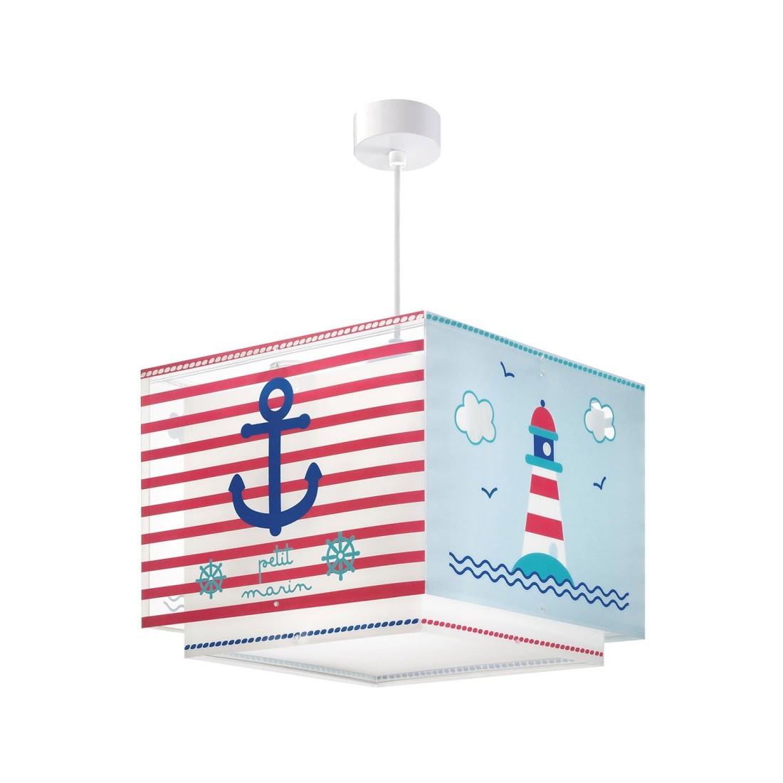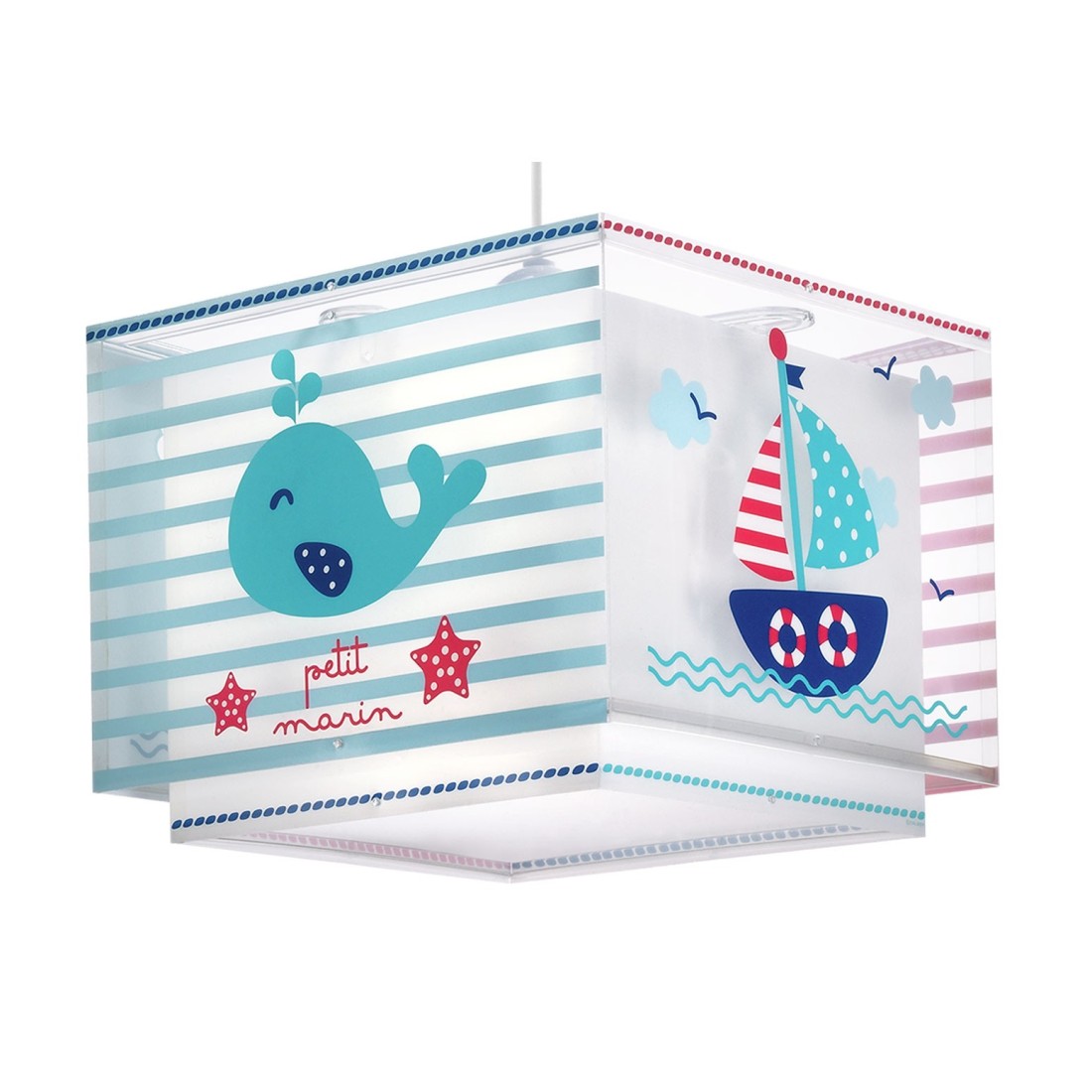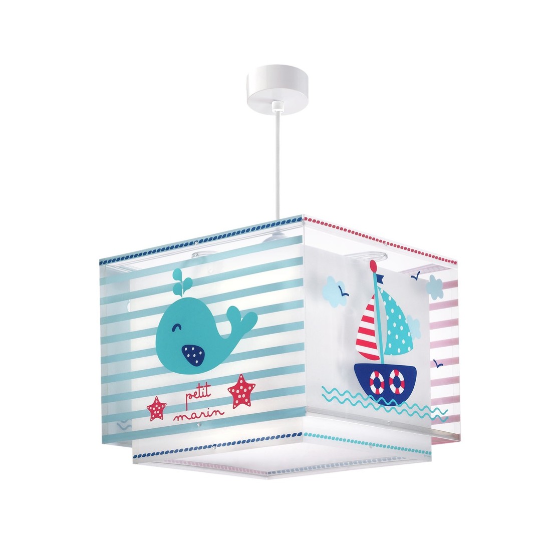 Βρεφικό φωτιστικό κρεμαστό οροφής κατάλληλο για γενικό φωτισμό. Διπλού τοιχώματος με διάφανο εξωτερικό τοίχωμα. Συνθετικό υλικό αντοχής πολυπροπυλενίου. Κιτ ανάρτησης ρυθμιζόμενο στο ύψος με διακοσμημένη ροζέτα. Παρέχεται διαχυτής φωτός για ομοιόμορφο φωτισμό.