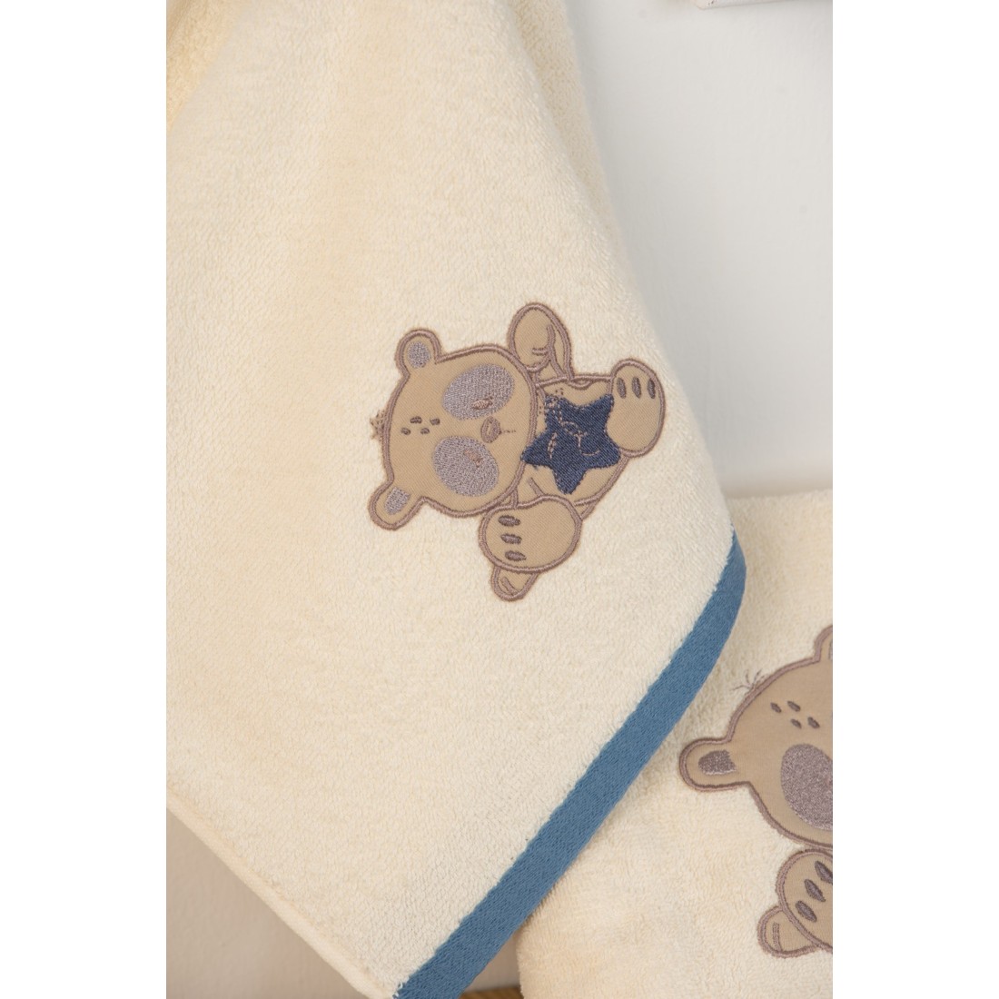 Σετ βρεφικές πετσέτες μπάνιου που περιέχει: 1 τεμάχιο πετσέτα χειρός διαστάσεων 30x50 και 1 τεμάχιο πετσέτα μπάνιου διαστάσεων 70x140.