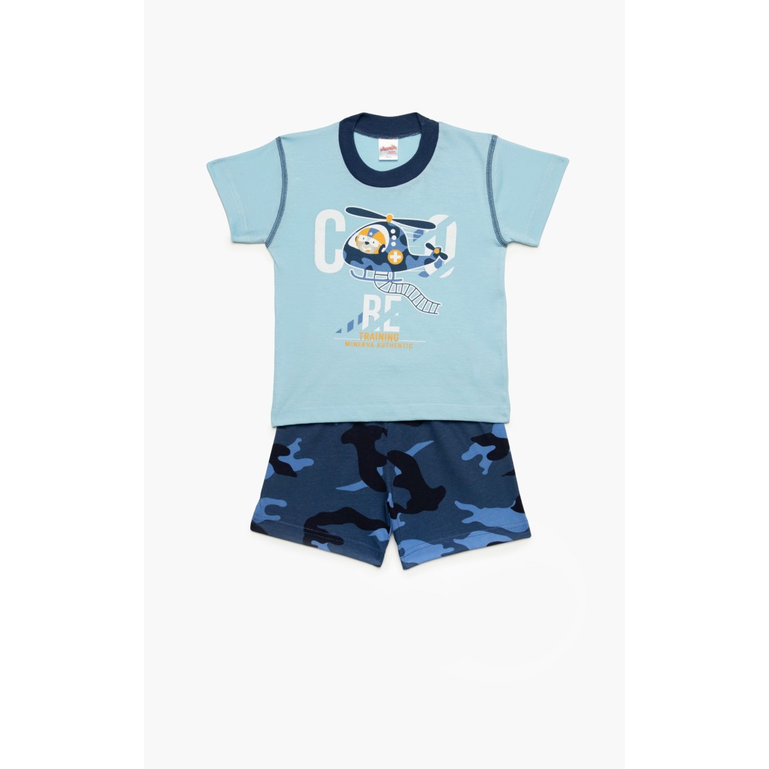 Βρεφική θερινή πιτζάμα για αγόρι από 100% απαλό βαμβακερό ύφασμα υψηλής ποιότητας. Το σετ περιλαμβάνει μονόχρωμη κοντομάνικη μπλούζα με τύπωμα και εμπριμέ military σορτσάκι με ελαστική μέση. Συνδυάστε με τις αντίστοιχες ανδρικές πιτζάμες και δημιουργήστε το απόλυτο father & son look.