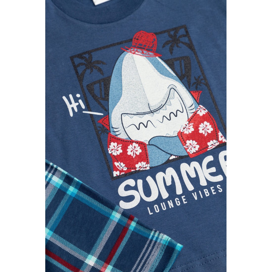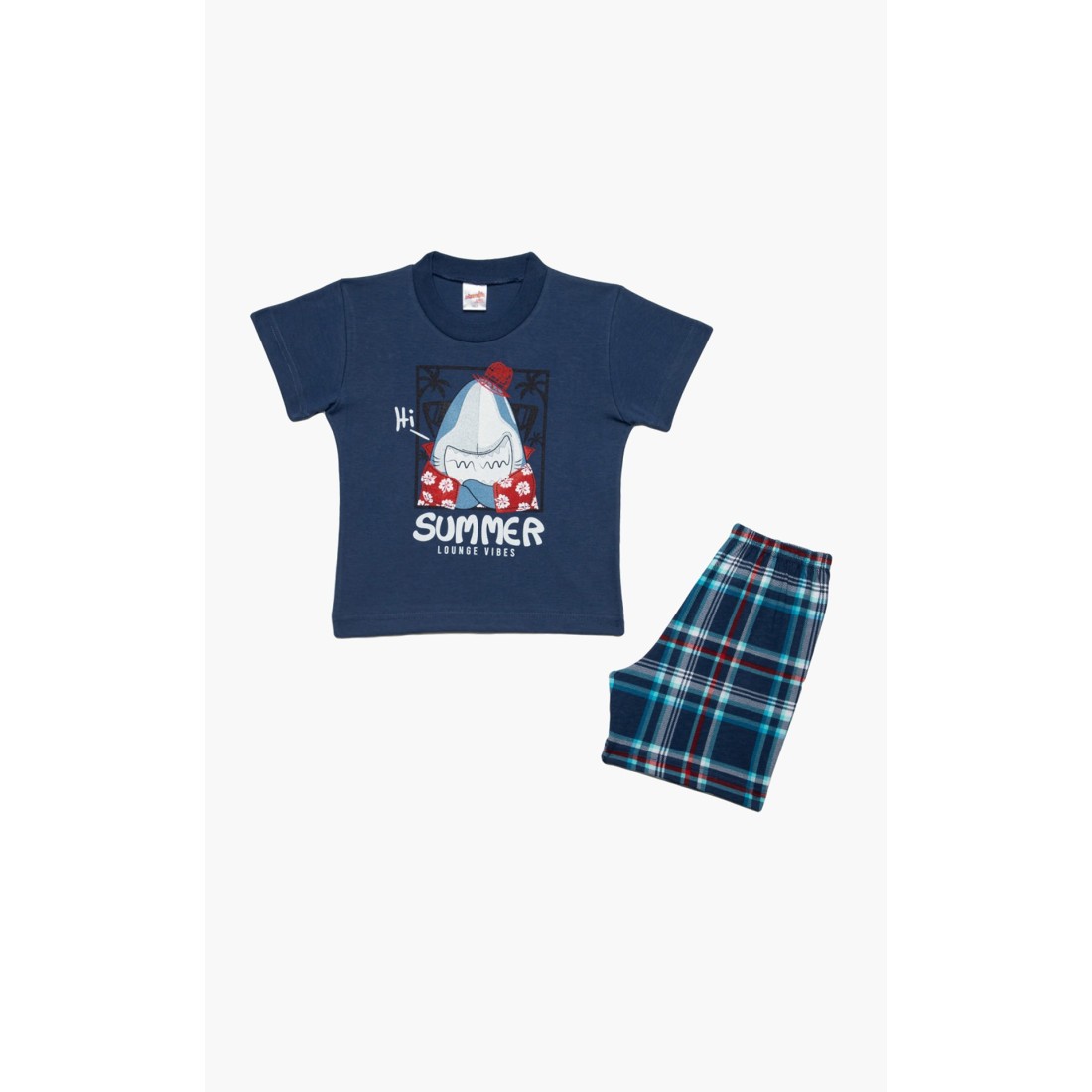 Βρεφική θερινή πιτζάμα για αγόρι από 100% απαλό βαμβακερό ύφασμα υψηλής ποιότητας. Το σετ περιλαμβάνει μονόχρωμη κοντομάνικη μπλούζα με τύπωμα και καρό σορτσάκι με ελαστική μέση. Συνδυάστε με τις αντίστοιχες ανδρικές πιτζάμες και δημιουργήστε το απόλυτο father & son look.