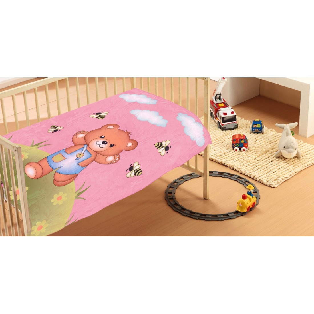 Βρεφική κουβέρτα βελουτέ απαλή και ζεστή με γούνινη υφή και ανεξίτηλα χαρούμενα χρώματα διαστάσεων 110Χ140, με βάρος 1100 gr.Ιδανικό δώρο για τη κούνια του μωρού σε συσκευασία κουτί πολυτελείας.