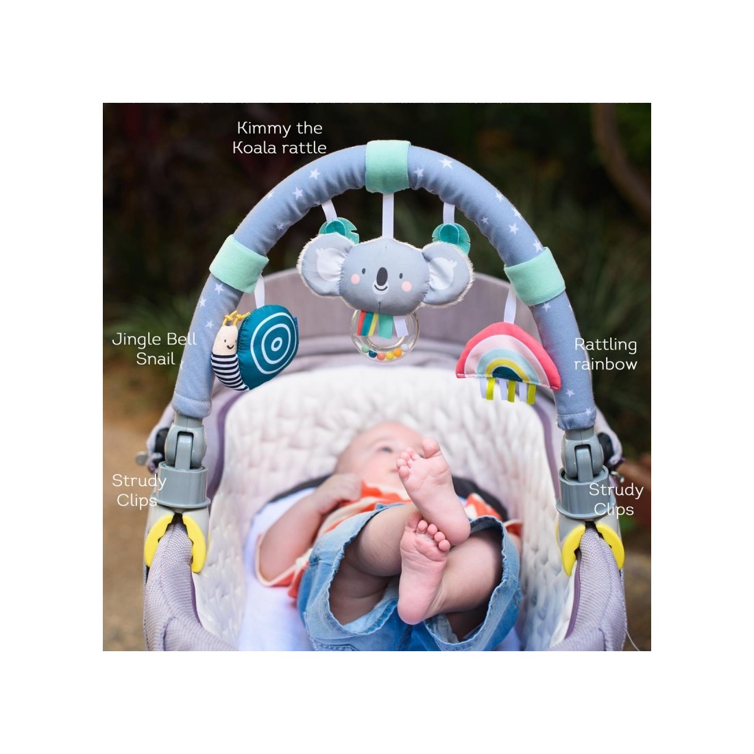 Περιλαμβάνει τρία κρεμαστά μαλακά παιχνίδια που προσφέρουν άφθονη δραστηριότητα: Kimmy το Koala, Scotty το σαλιγκάρι και ένα πολύχρωμο ουράνιο τόξο με συναρπαστική κίνηση και ήχο κουδουνίσματος