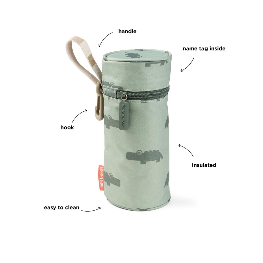 Η ισοθερμική θήκη Croco kids κρατάει το εσωτερικό ρόφημα του παιδιού σας δροσερό ή ζεστό εν κινήσει. Το ύφασμα στο εσωτερικό του εξασφαλίζει ότι τα ροφήματα διατηρούν την επιθυμητή θερμοκρασία τους για ώρες. Τα παγούρια της Done by Deer ταιριάζουν τέλεια στη θήκη αυτή.