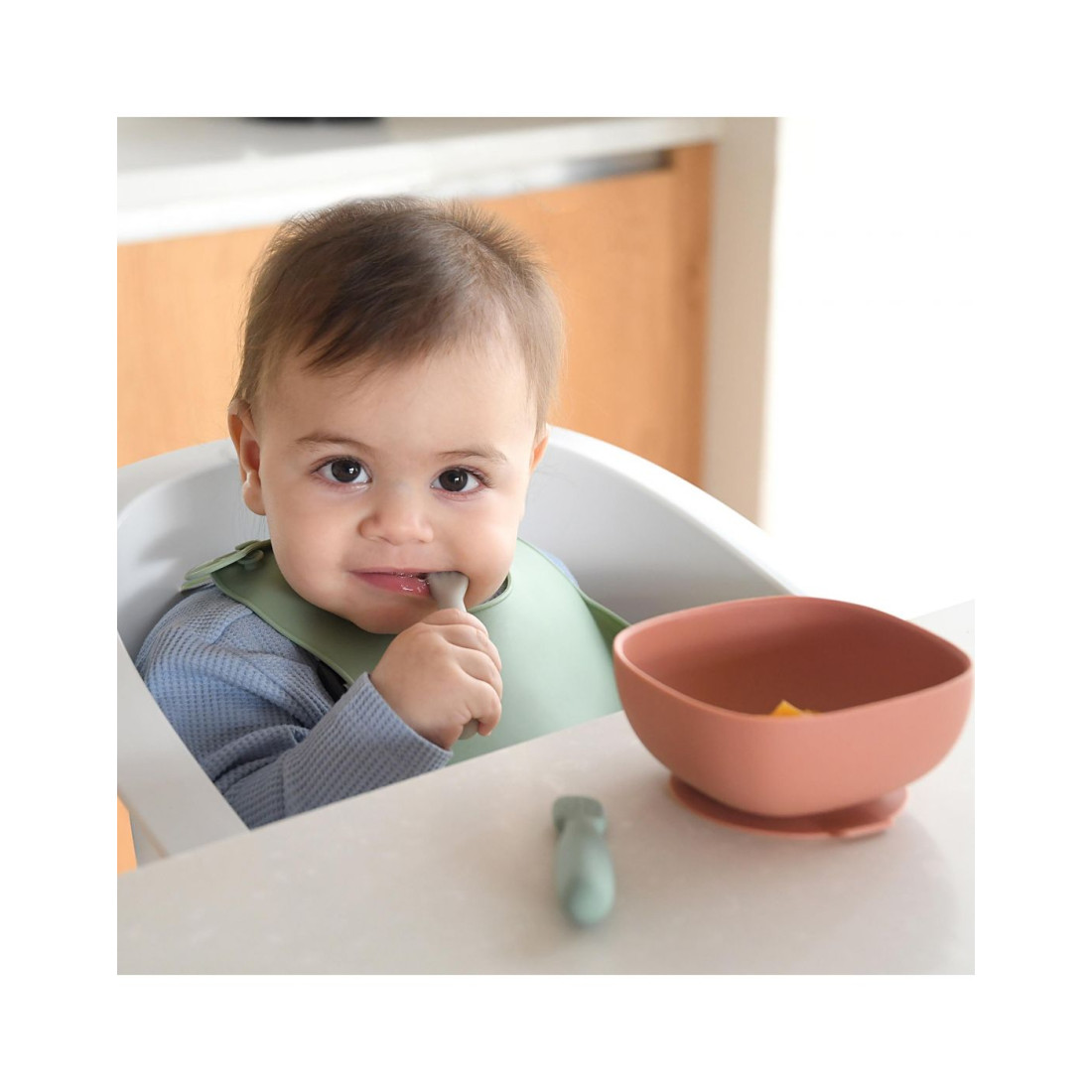 Για νέους καλοφαγάδες ! Χρησιμοποιήστε από 4 μηνών,ες, με έναν ενήλικα για να εξοικειωθείτε με το κουτάλι και τις πρώτες τροφές τους. Από 6/8 μήνες, μόνοι τους για να αποκτήσουν σταδιακά ανεξαρτησία. Κοντή, στρογγυλεμένη λαβή με μικρό όγκο: επιτρέπει στο μωρό να πιάσει το κουτάλι με 3 διαφορετικούς τρόπους (λαβή παλάμης, λαβή τσιμπίδας ή λαβή γροθιάς). Ανάγλυφες άκρες (κυματισμοί και σπυράκια): σχεδιασμένες για να βελτιστοποιούν το κράτημα των τροφίμων. Επίπεδες άκρες: έτσι ώστε το κουτάλι να μην γεμίσει υπερβολικά, μπορεί να χρησιμοποιηθεί και στις δύο πλευρές και δεν απαιτεί περιστροφή του καρπού. Ευέλικτες συμβουλές: ειδικά σχεδιασμένες για να προσαρμόζονται στις ανάγκες του παιδιού (το αόριστο κουτάλι είναι λιγότερο εύκαμπτο από την έκδοση picots) Συμμετρικά σχήματα: μπορεί να χρησιμοποιηθεί με το αριστερό ή το δεξί χέρι Εύπλαστη σιλικόνη: ένα μαλακό, ευχάριστο υλικό που δεν βλάπτει Φροντίδα: πλύσιμο στο χέρι ή πλυντήριο πιάτων