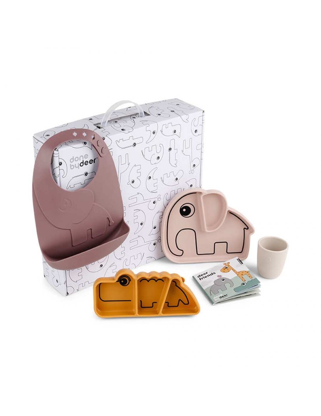 Το παιδικό σετ φαγητού περιλαμβάνει ένα πιάτο silicone stick & stay με elphee, ένα σνακ πιάτο silicone stick & stay με croco, μια σαλιάρα peekaboo, μια μίνι κούπα σιλικόνης και βιβλίο με τους φίλους των ελαφιών.