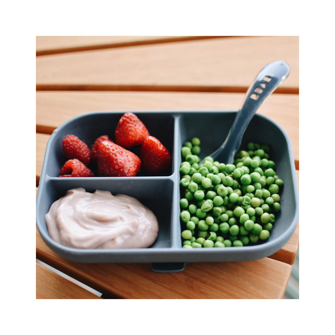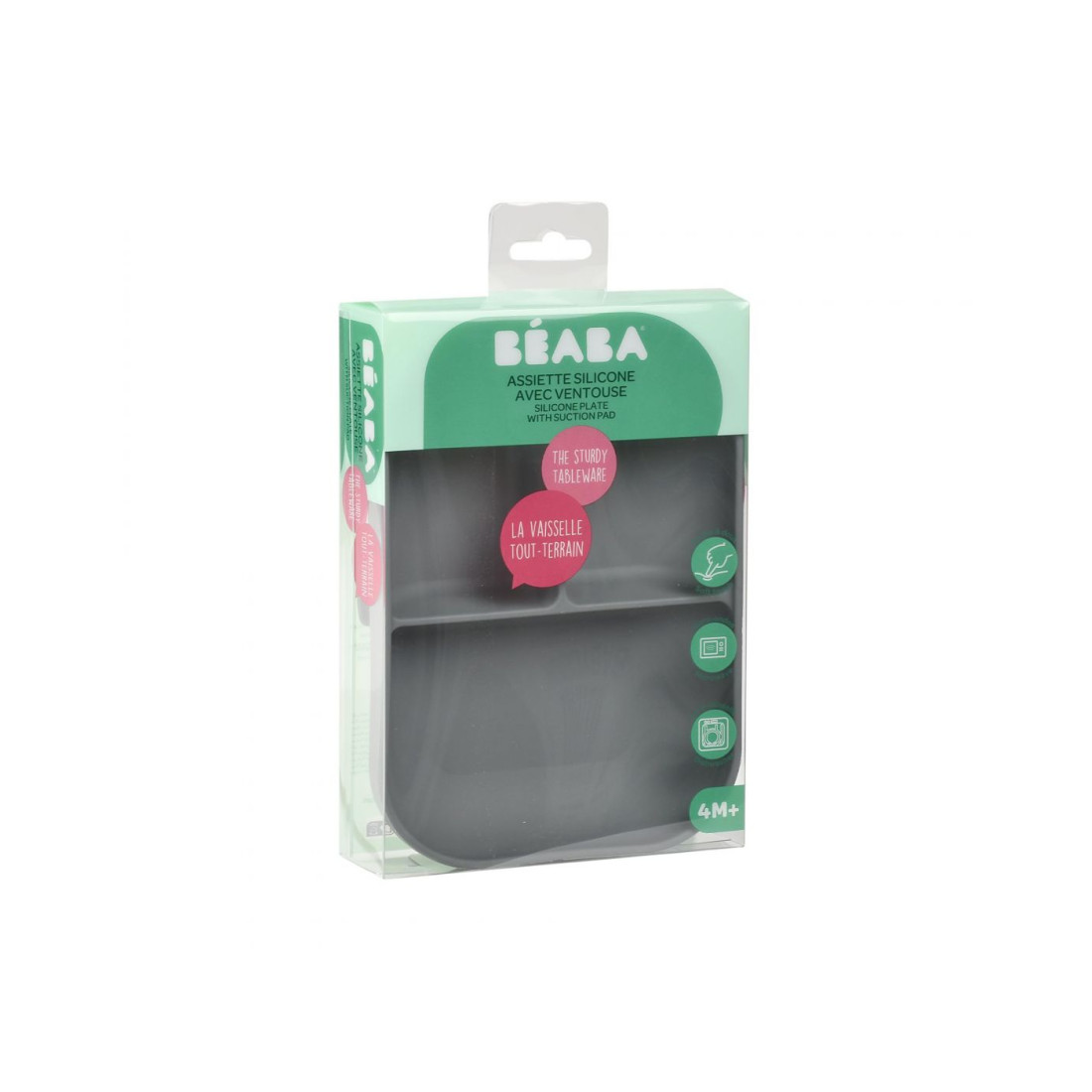 Τα ανθεκτικά επιτραπέζια σκεύη! Εργονομικό σχήμα και άθραυστο μαλακό υλικό σιλικόνης για να βοηθήσει τα μωρά να μάθουν ήρεμα να τρώνε μόνα τους Διαμερισματοποιημένο πιάτο: έτσι ώστε κάθε τύπος τροφίμου να διατηρεί τη γεύση του και να διαχωρίζει τις διαφορετικές υφές Κάνει τα γεύματα εύκολα: βοηθά τους γονείς να ελέγχουν το τάισμα του μωρού (τρόφιμα που δεν τους αρέσουν, αλλεργίες κ.λπ.) Διαθέτει βεντούζα στο κάτω μέρος για να κολλάει στο τραπέζει και να αποφεύγονται τα ατυχήματα Σιλικόνη: απαλή αφή, κολλάει στη βάση και είναι ανθεκτική σε περίπτωση πτώσης Φροντίδα: πλύσιμο στο χέρι ή πλυντήριο πιάτων