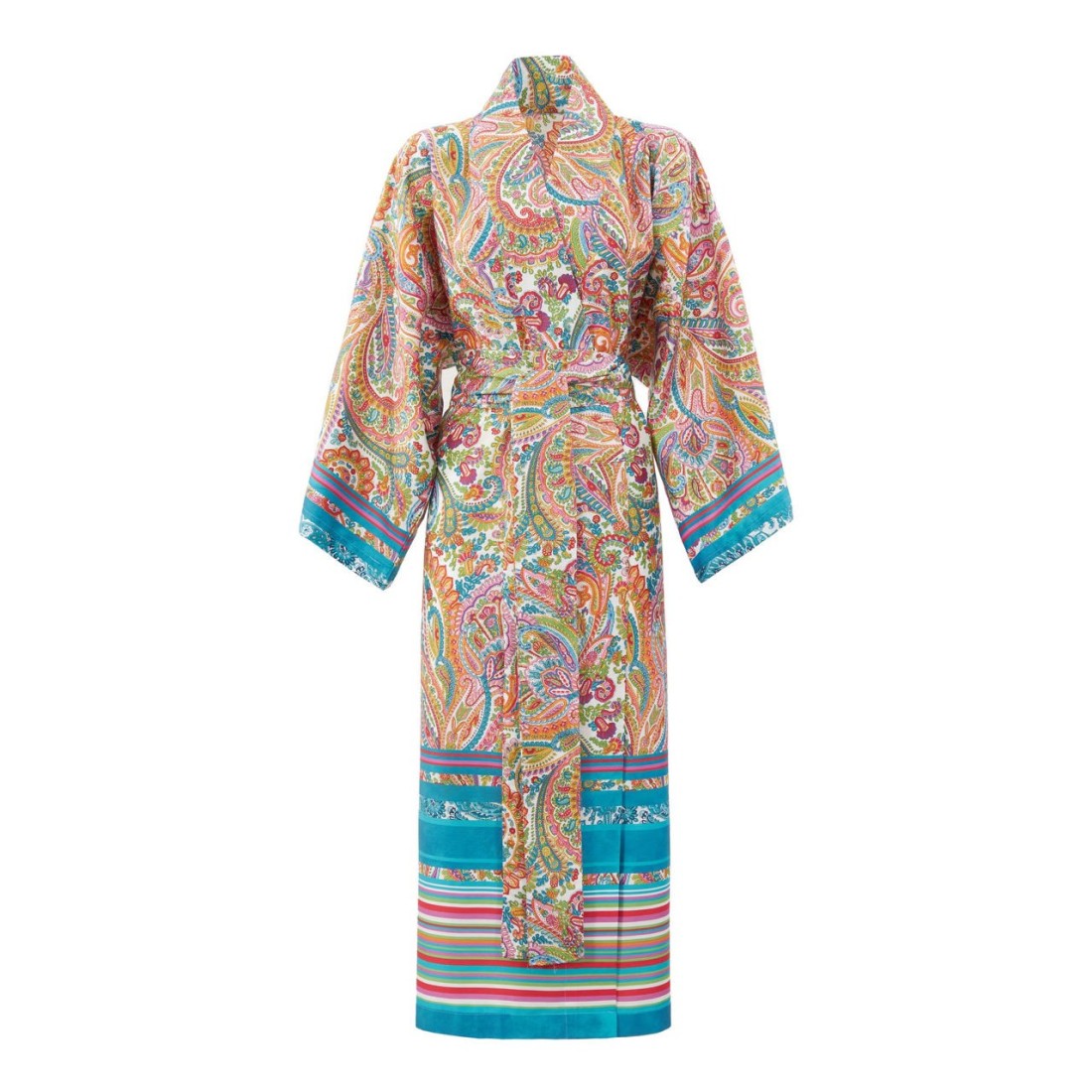 Κιμονό Noto από πολύτιμο καθαρό βαμβακερό σατέν με 110 κλωστές ανά cm² από τη συλλογή Granfoulard Fall - Winter. Το σχέδιο ερμηνεύει εκ νέου ένα κομψό boho μοτίβο χαρακτηριστικό του mezzaro.