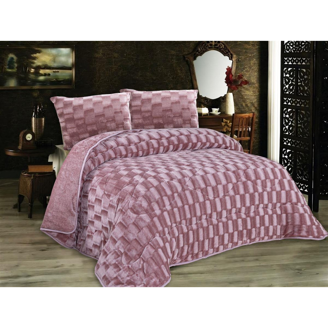 Κουβερτοπάπλωμα διαστάσεων 220X240 cm με καπιτοναρισμένο σχέδιο. εξαιρετικής ποιότητας με επένδυση απαλό fleece με Εφέ 250 gr/m²(πάνω πλευρά). 200 gr/m² fleece (κάτω πλευρά) και αντιαλλεργική βάτα 300 gsm. Ιδιαίτερα ζεστό. κατάλληλο για τις κρύες νύχτες του χειμώνα. Συσκευασία PVC-Wired Bag με χερούλι. Βάρος gsm : 750 gr/m² Συνολικό βάρος με τις ραφές : 3960γρ.