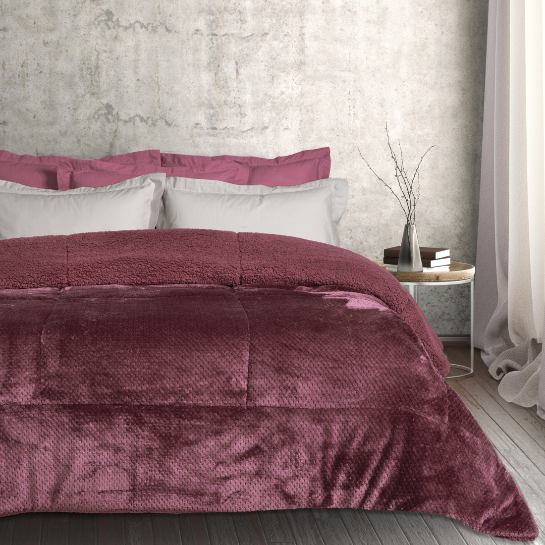 Κουβερτοπάπλωμα μονόχρωμο από ύφασμα fleece με ανάγλυφο σχέδιο και γούνα sherpa. Το εξωτερικό του ύφασμα είναι από 100% polyester ενώ το εσωτερικό του αποτελείται από ίνες hollowfibre. ειδικά μελετημένο για απαλή υφή. Ιδιαίτερα ζεστό. υποαλλεργικό. ιδιαίτερα μαλακό και ανθεκτικό στη χρήση με βάρος 700gr/m². με θερμιδική απόδοση 12TOG. Διατίθεται σε διάσταση 160Χ220εκ. Das home...makes your house a home!-Πλύσιμο στους 30°C. Όχι σιδέρωμα. Όχι χρήση χλωρίου ή λευκαντικού. Χρήση στεγνωτηρίου σε χαμηλή θερμοκρασία. Όχι στεγνό καθάρισμα.