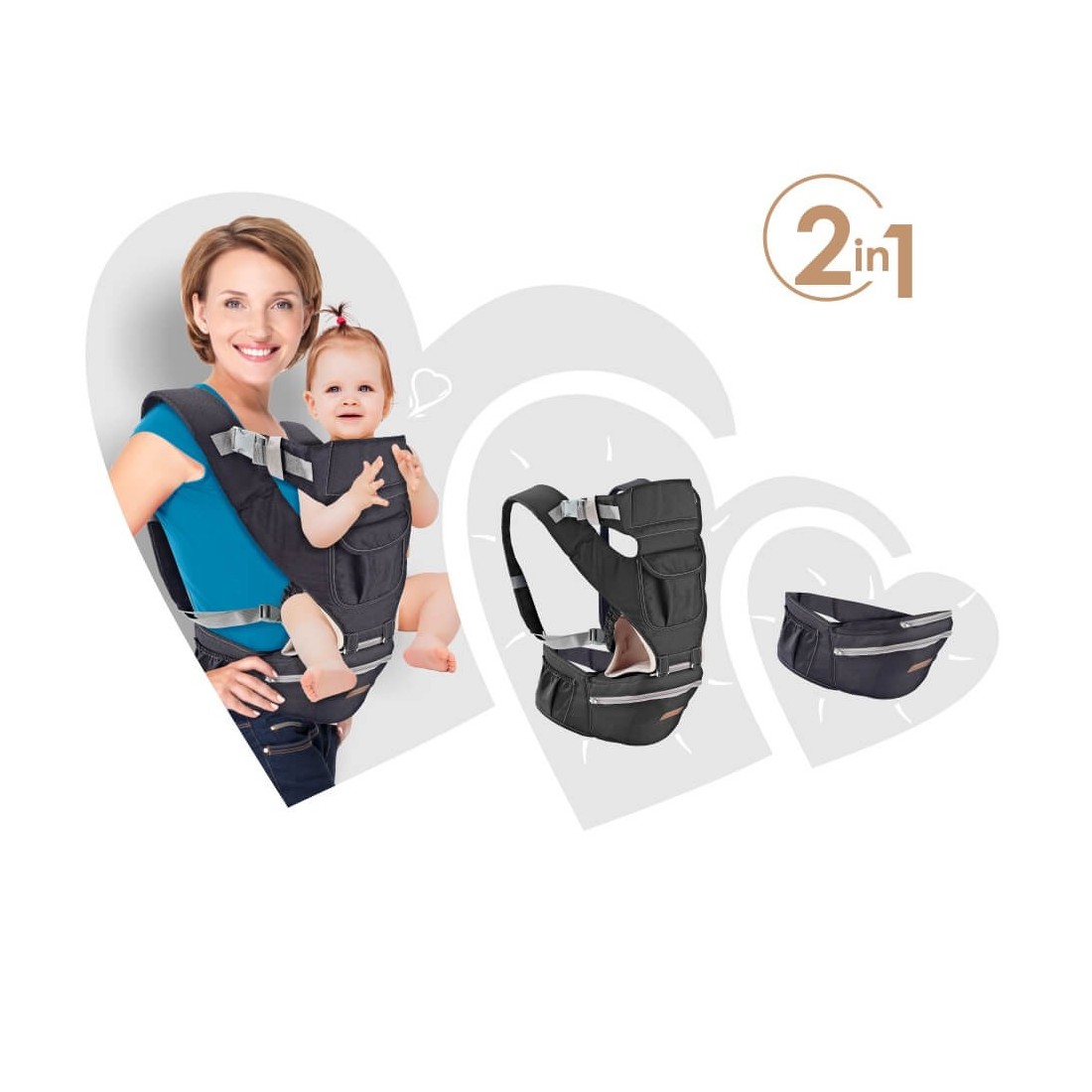 Ένα μοναδικό χαρακτηριστικό του μάρσιπου Carry & Go είναι η ικανότητά του να μετατρέπεται σε κάθισμα μέσης. Απλώς αποσυνδέστε τους ιμάντες ώμου και τη ζώνη μέσης και ο μάρσιπος μεταμορφώνεται σε ένα άνετο κάθισμα για να κάθεται το μωρό σας. Αυτό διευκολύνει τη μεταφορά του μικρού σας στο σπίτι ή σε μικρές διαδρομές.