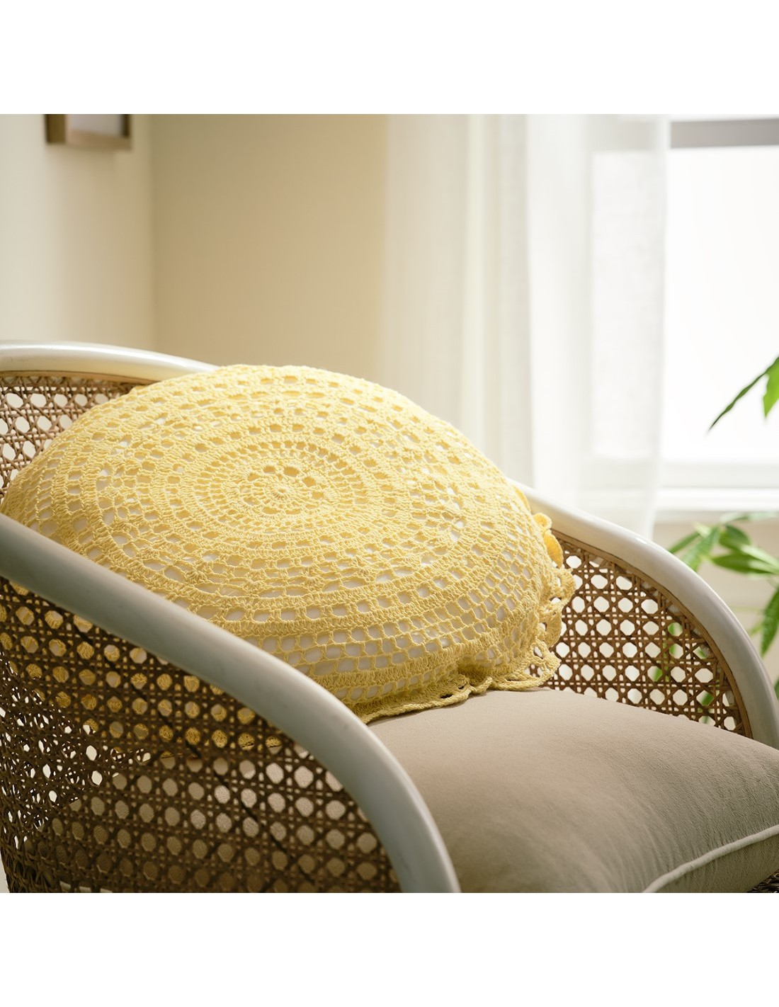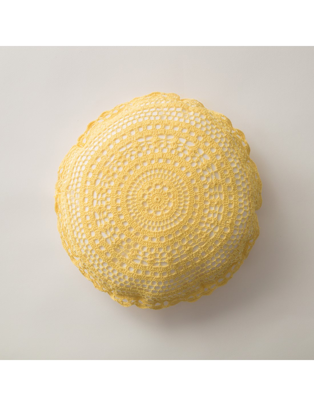 Στρόγγυλο πλεκτό μαξιλαράκι από βαμβακερό νήμα με γέμιση.