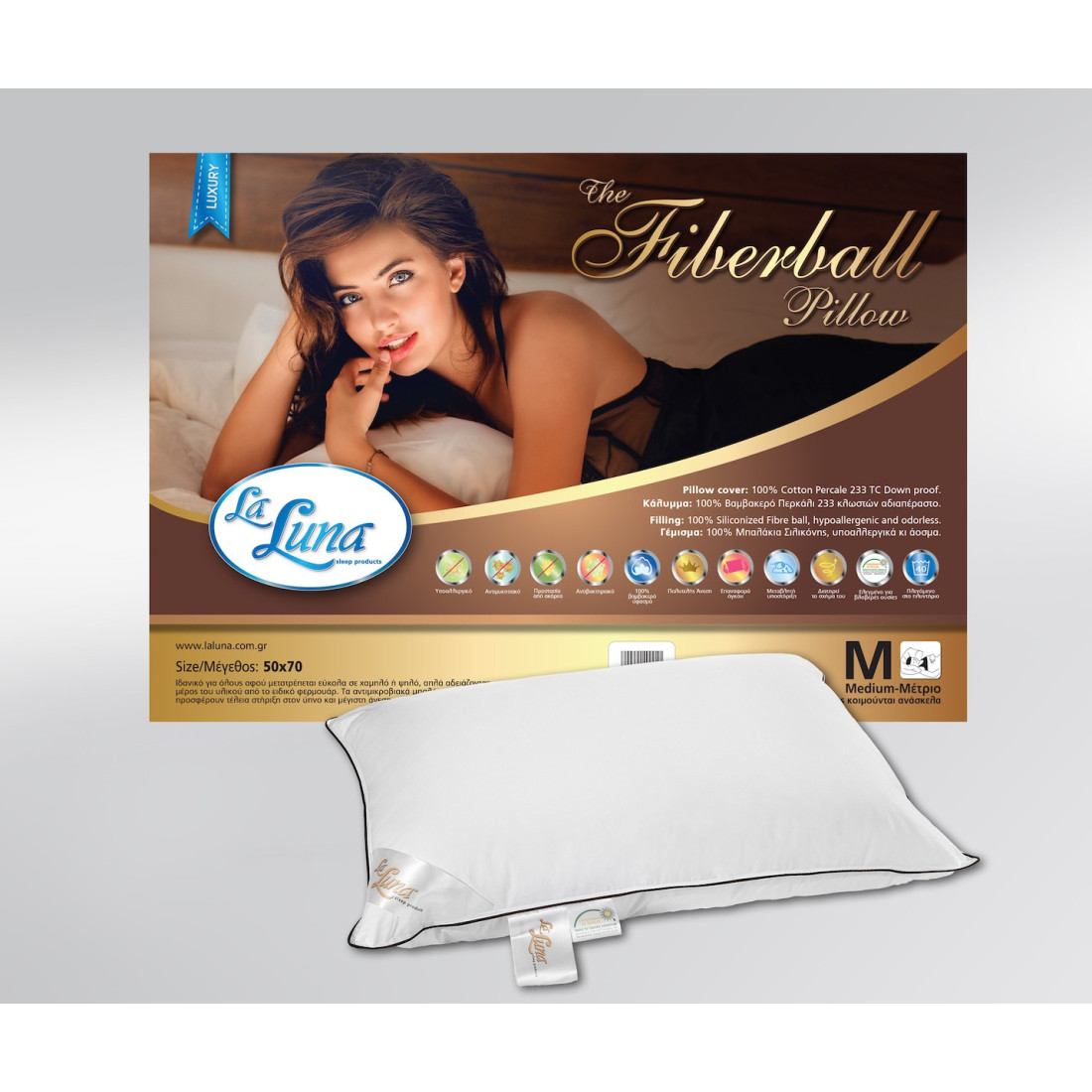 Μαξιλάρι γεμισμένο με εξαιρετικής ποιότητας μπαλάκια πολυεστέρα με επικάλυψη σιλικόνης. Είναι αντιμικροβιακά. αντιαλλεργικά και εμποδίζουν τη δημιουργία οσμών. Προσφέρουν στο μαξιλάρι τέλεια θερμοκρασία στον ύπνο. εξασφαλίζουν μέγιστη άνεση. διατηρούν το σχήμα τους και είναι φιλικά στο περιβάλλον. Διατείθεται και στους τρεις τύπους υποστήριξης (μαλακό. μέτριο και σκληρό) για να επιλέξετε αυτό που ταιριάζει καλύτερα σε εσάς ανάλογα με την στάση που κοιμάστε (μπρούμυτα ανάσκελα ή στο πλάι). Παρέχει τη δυνατότητα μεταβολής του τύπου του μαξιλαριού αδειάζοντας μέρος του υλικού από το ειδικό φερμουάρ. Ύφασμα: Περκάλι 100% βαμβακερό 233ων κλωστών με φερμουάρ και ρέλι. Περιεχόμενο: Ειδικά σχεδιασμένα μπαλάκια πολυεστέρα με επικάλυψη σιλικόνης (Hollow Conjugate siliconized Ball Fiber).