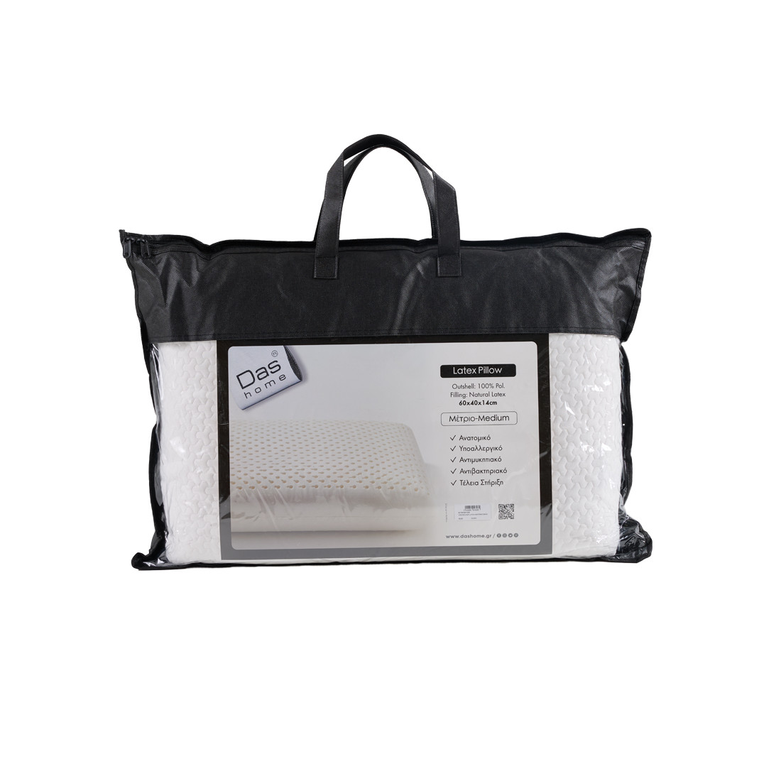 Ανατομικό μαξιλάρι latex μέτριας σκληρότητας 1450gr της σειράς Comfort. Είναι από 100% φυσικό latex ενώ τo εξωτερικό ύφασμα είναι 100% polyester ειδικά σχεδιασμένο ώστε να επιτρέπει την κυκλοφορία του αέρα. Έχει αντιβακτηριακή και αντιμικροβιακή προστασία. είναι υποαλλεργικό και προσφέρει τέλεια στήριξη. Διατίθεται σε διάσταση 60Χ40εκ. Το κάλυμμα αφαιρείται και πλένεται. Das home...makes your house a home!-Πλύσιμο στους 30°C. Όχι χρήση χλωρίου ή λευκαντικού. Όχι χρήση στεγνωτηρίου. Το εσωτερικό δεν πλένεται.