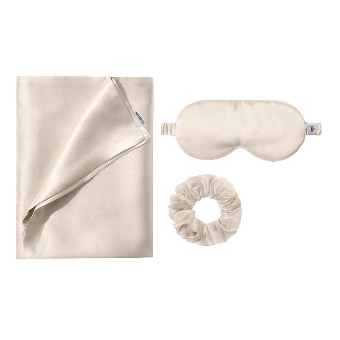 Σετ 3 τεμαχίων \"Beauty Sleep\"" αποτελούμενο από μία μαξιλαροθήκη, μάσκα ύπνου και scrunchie (λαστιχάκι μαλλιών) με την υπογραφή της FEEL & TOUCH. To σετ είναι κατασκευασμένο από 100% Mulberry Silk, από τα καλύτερα ήδη μεταξιού στον κόσμο. Ιδανικό για να αναβαθμίσετε την ποιότητα του ύπνου σας, των μαλλιών σας και της επιδερμίδας σας. Ανακαλύψτε όλα τα χρώματα της συλλογής \""Beauty Sleep\""."