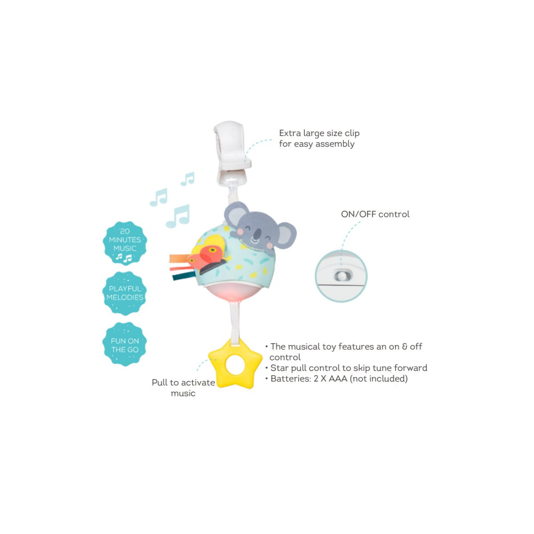 Αυτό το μουσικό παιχνίδι μπορεί να συνδεθεί εύκολα στις βρεφικές κούνιες, στα καθίσματα του αυτοκινήτου και σχεδόν οπουδήποτε, καθιστώντας το ένα υπέροχο παιχνίδι με το οποίο μπορεί να παίξει το μωρό καθώς μεγαλώνει. Ελαφρύ, διπλώνει εύκολα και διαθέτει πολύ μεγάλο πλαστικό κλιπ, ώστε να μπορεί να συνδεθεί με καροτσάκια, καθίσματα αυτοκινήτου και βρεφικές κούνιες! Το μωρό χαλαρώνει με τον συνδυασμό κίνησης και μουσικής.