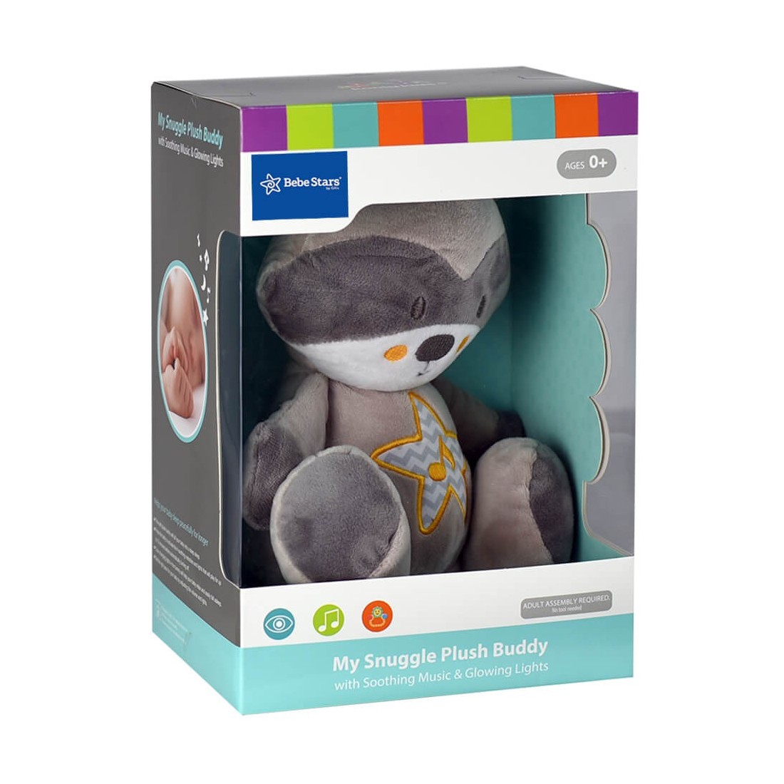 Οι μικροί μας φίλοι μπορούν να αποκοιμηθούν παρέα με τον Φωτεινό Αγκαλίτσα Raccoon της Bebe Stars! Αγκαλιάστε το και πατήστε την κοιλίτσα του, το αστεράκι θα φωτιστεί και τα παιδιά θα έχουν μια παρέα μέσα στο σκοτάδι! Η βελούδινη υφή του και η απαλή μελωδία βοηθάει το μωρό σας να κοιμηθεί πιο ήρεμα και για μεγαλύτερο χρονικό διάστημα.