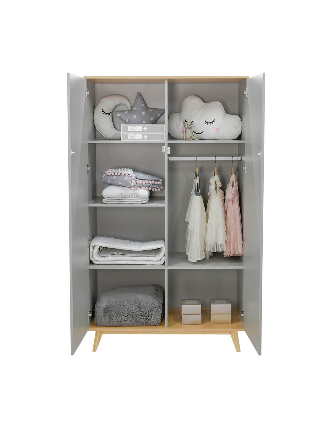 Μοντέρνα δίφυλλη ντουλάπα η οποία διαθέτει μηχανισμό touch open, δυο μεγάλες πόρτες, πέντε μεγάλα ράφια, και μια βέργα κρέμασης. Σας προσφέρει ποικίλους τρόπους για να κρεμάτε και να αποθηκεύετε τα ρουχαλάκια του μωρού σας.