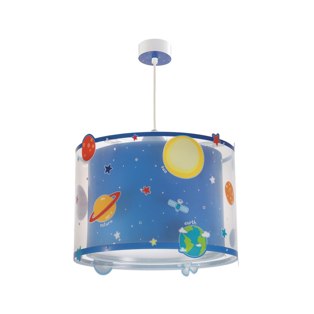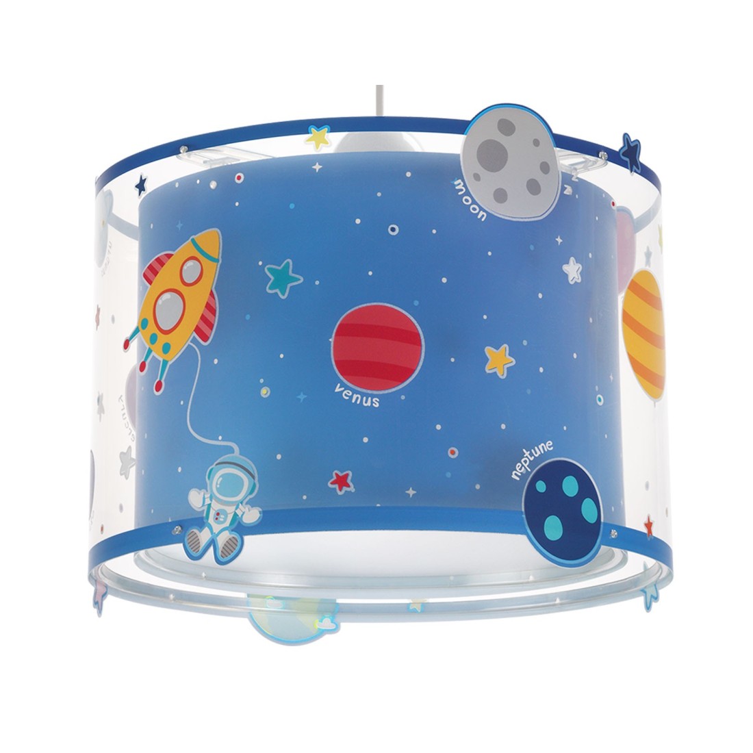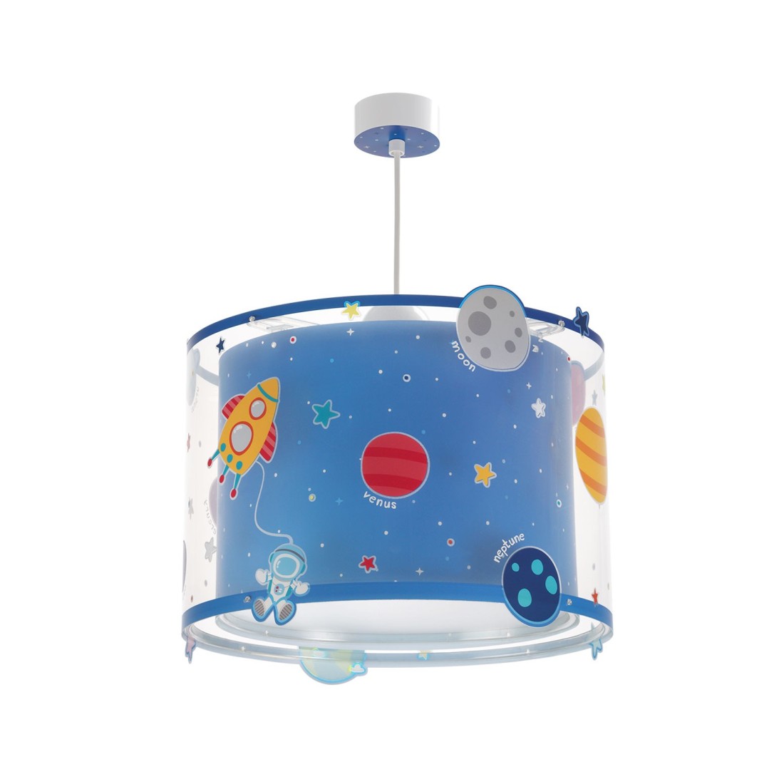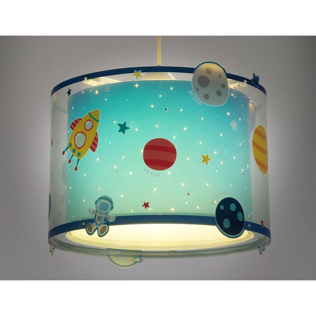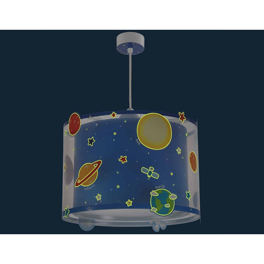 Παιδικό φωτιστικό οροφής κρεμαστό μεγάλο σε μέγεθος και κατάλληλο για γενικό φωτισμό. Διπλού τοιχώματος με διάφανο εξωτερικό τοίχωμα και φωσφορίζοντα στο σκοτάδι μέρη. Συνθετικό υλικό αντοχής πολυπροπυλενίου. Κιτ ανάρτησης ρυθμιζόμενο στο ύψος με διακοσμημένη ροζέτα. Παρέχεται διαχυτής φωτός για ομοιόμορφο φωτισμό.