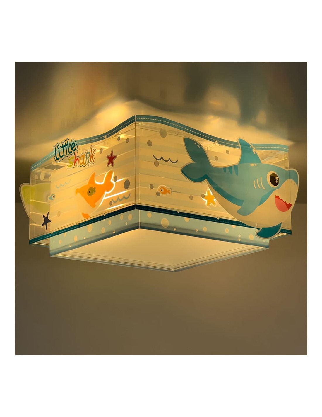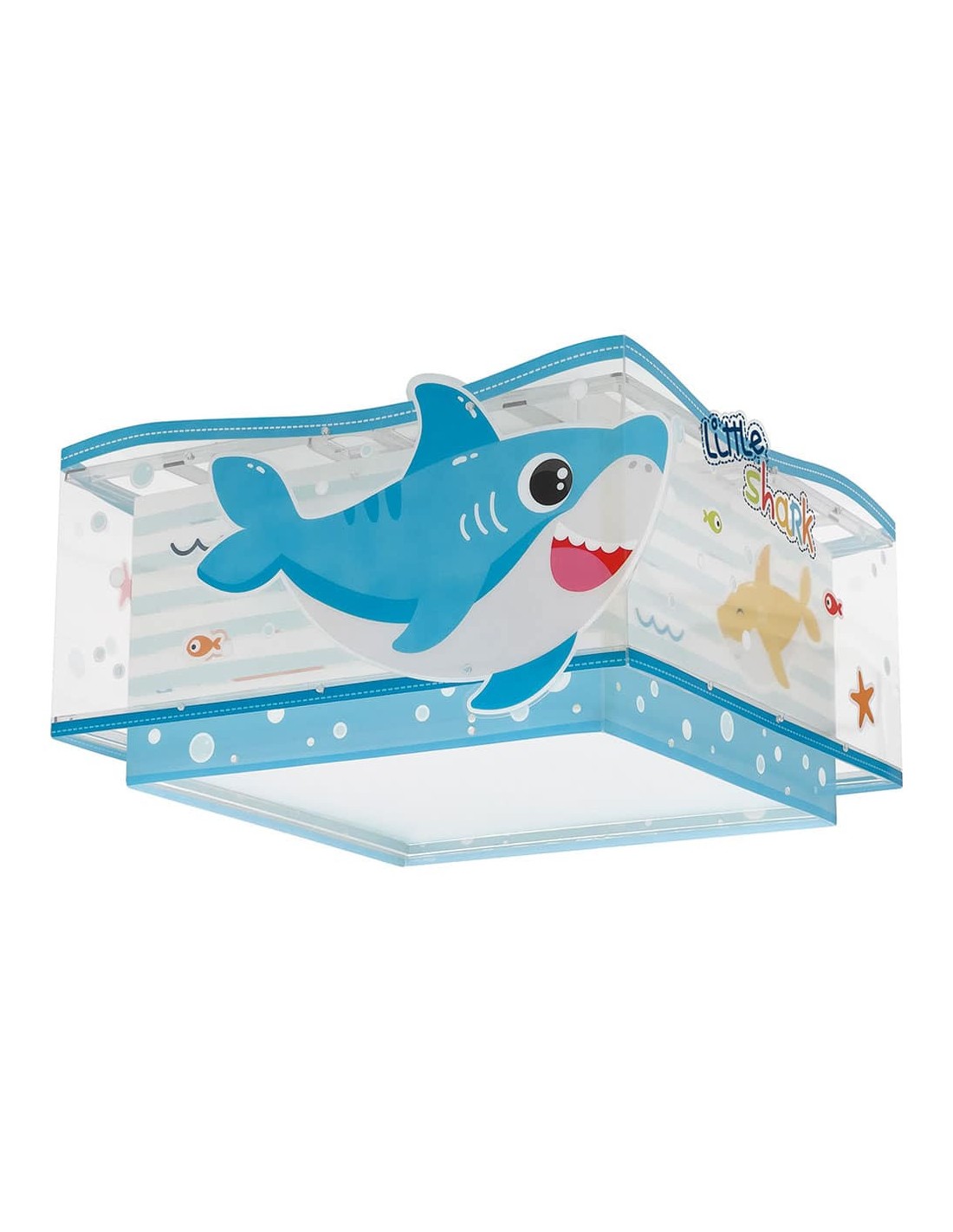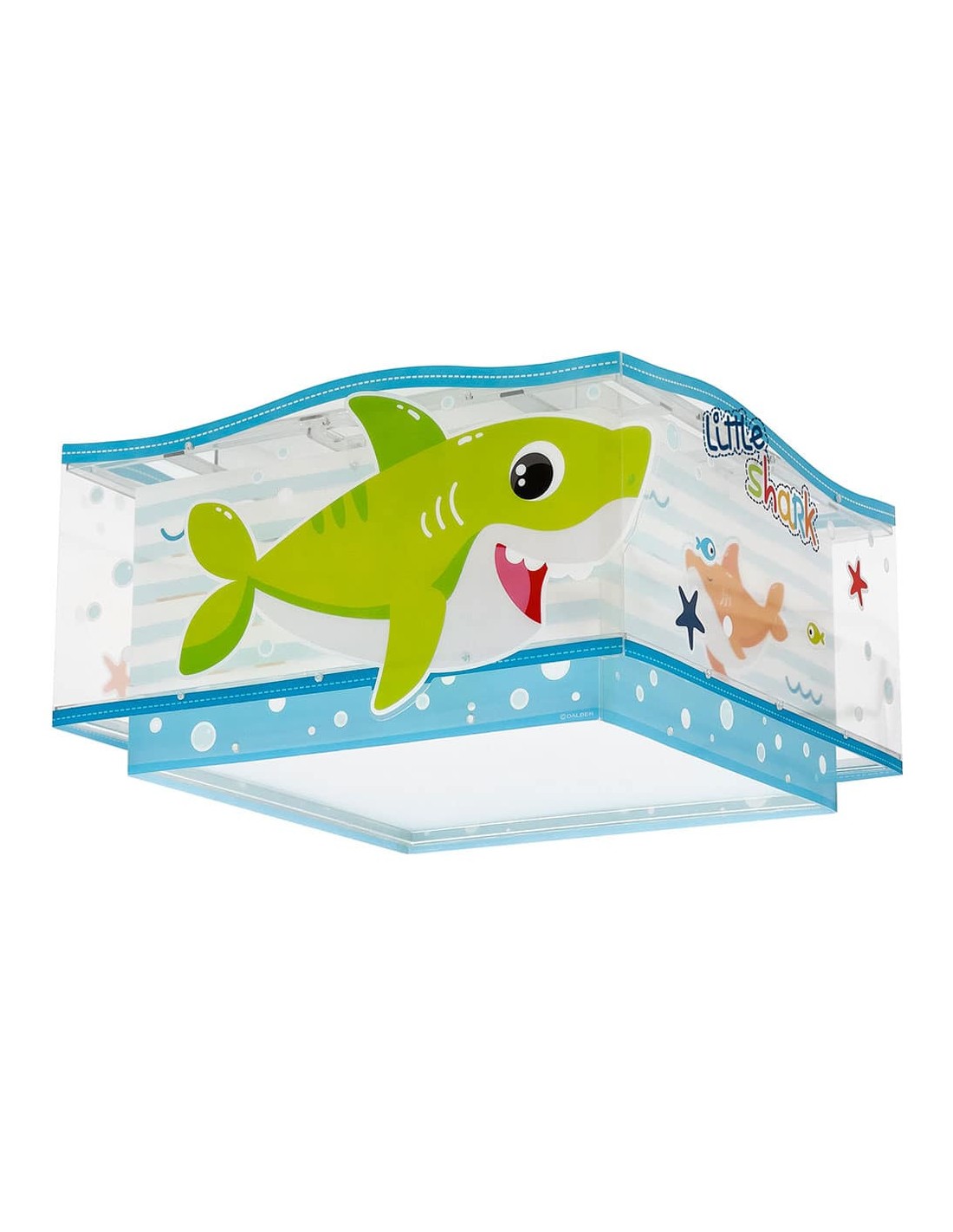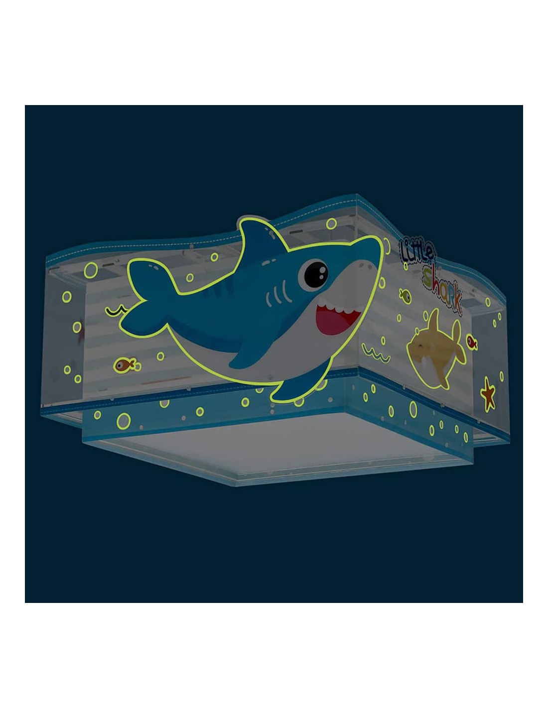 Παιδικό φωτιστικό οροφής τύπου πλαφονιέρα κατάλληλο για γενικό φωτισμό και όλες τις δραστηριότητες των παιδιών με θέμα τους καρχαρίες. Είναι διπλού τοιχώματος από άκαυστο λεπτό πολυπροπυλένιο και φωσφορίζοντα στο σκοτάδι μαγικά εξωτερικά μέρη. Τοποθετείται εύκολα και γρήγορα και είναι εφοδιασμένο με δύο θέσεις λαμπτήρων LED για πραγματικά άπλετο φως στο δωμάτιο.  Παρέχεται διαχυτής φωτός για τις μικρότερες ηλικίες που προσφέρει ομοιόμορφο φωτισμό αλλά και προστασία.  Κατασκευασμένο εξ ολοκλήρου στην Ευρώπη