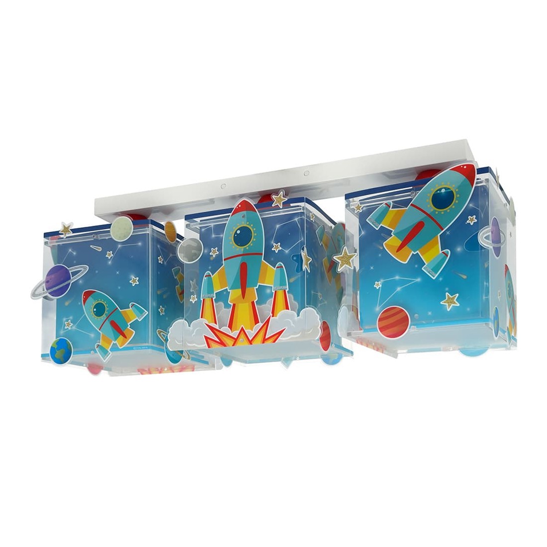 Τρίφωτο παιδικό φωτιστικό οροφής σε διάταξη ράγας κατάλληλο για γενικό φωτισμό και θέμα τους πυραύλους στο διάστημα. Το Rocket τρίφωτο οροφής ράγας είναι κατασκευασμένο με διάφανα καπέλα διπλού τοιχώματος από άκαυστο λεπτό πολυπροπυλένιο και φωσφορίζοντα στο σκοτάδι εξωτερικά μέρη. Κιτ ανάρτησης σε σχήμα ράγας και εύκολο τρόπο στήριξης click & go. Τύπος ντουί E27 με θέσεις για τρεις λαμπτήρες LED για άπλετο φως στο δωμάτιο. Παρέχονται 3 διαχυτές φωτός για τις μικρότερες ηλικίες προσφέροντας ομοιόμορφο φωτισμό αλλά και την προστασία των ματιών. Το Rocket τρίφωτο οροφής ράγας είναι κατασκευασμένο εξ ολοκλήρου στην Ευρώπη το και συμπληρώνει τα υπόλοιπα παιδικά φωτιστικά της συλλογής κομοδίνου, απλίκα ή νυκτός.
