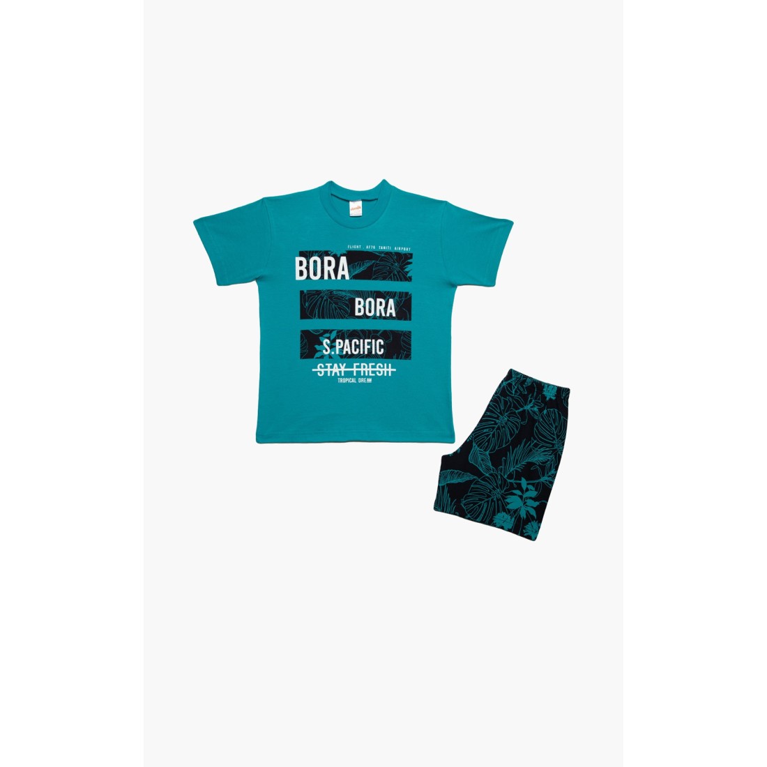 Παιδική θερινή πιτζάμα για αγόρι από 100% απαλό βαμβακερό ύφασμα υψηλής ποιότητας. Το σετ περιλαμβάνει κοντομάνικη μονόχρωμη μπλούζα με στρογγυλή λαιμόκοψη, tropical τύπωμα και εμπριμέ tropical σορτς με ελαστική μέση. Συνδυάστε με τις αντίστοιχες ανδρικές πιτζάμες και δημιουργήστε το απόλυτο father & son look.