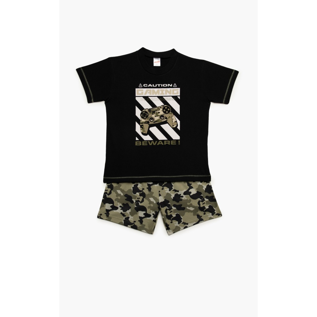 Παιδική θερινή πιτζάμα για αγόρι από 100% απαλό βαμβακερό ύφασμα υψηλής ποιότητας. Το σετ περιλαμβάνει κοντομάνικη μονόχρωμη μπλούζα με στρογγυλή λαιμόκοψη, gaming τύπωμα και εμπριμέ military σορτς με ελαστική μέση. Συνδυάστε με τις αντίστοιχες ανδρικές πιτζάμες και δημιουργήστε το απόλυτο father & son look.