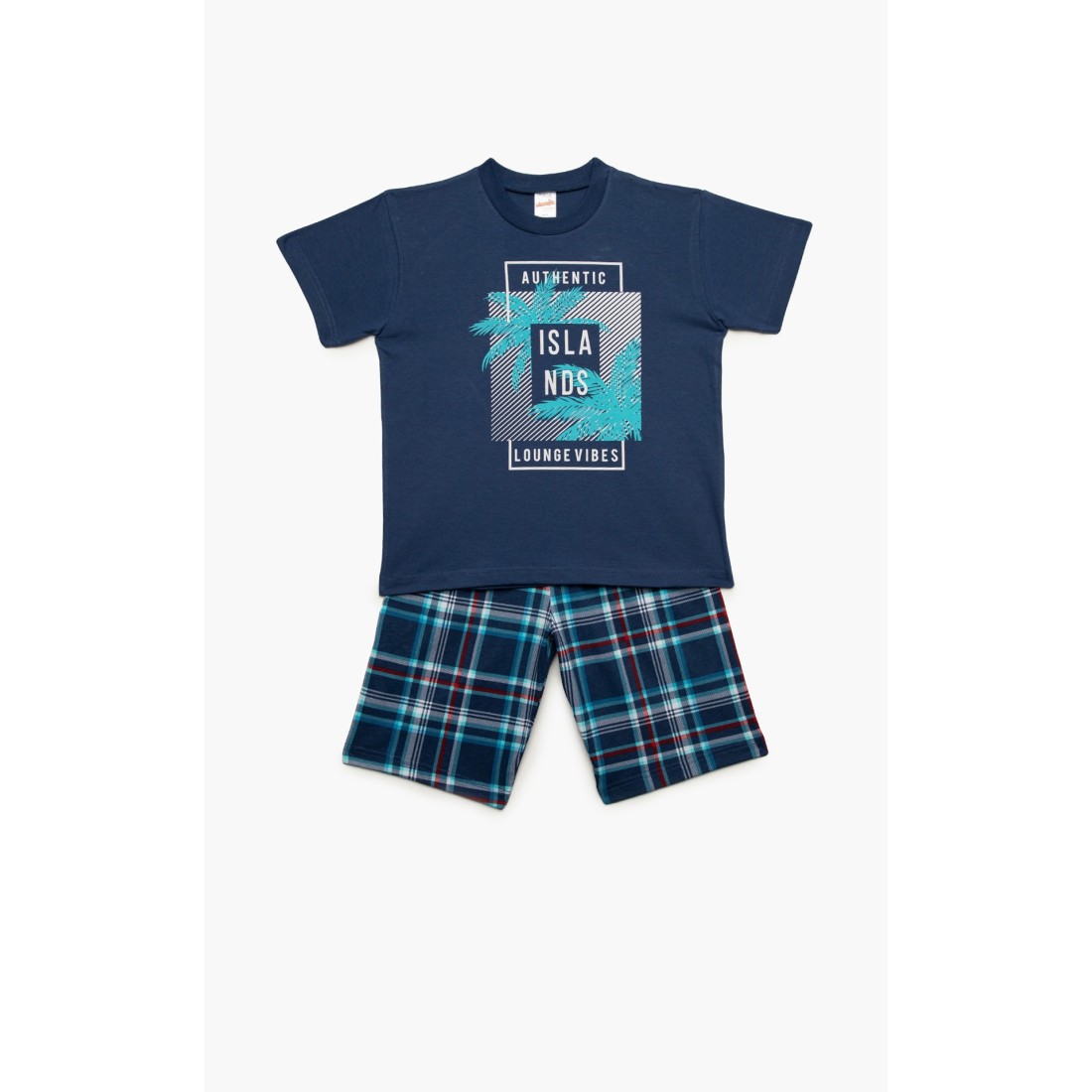 Παιδική θερινή πιτζάμα για αγόρι από 100% απαλό βαμβακερό ύφασμα υψηλής ποιότητας. Το σετ περιλαμβάνει κοντομάνικη μονόχρωμη μπλούζα με στρογγυλή λαιμόκοψη, tropical τύπωμα και καρό βερμούδα με ελαστική μέση. Συνδυάστε με τις αντίστοιχες ανδρικές πιτζάμες και δημιουργήστε το απόλυτο father & son look.