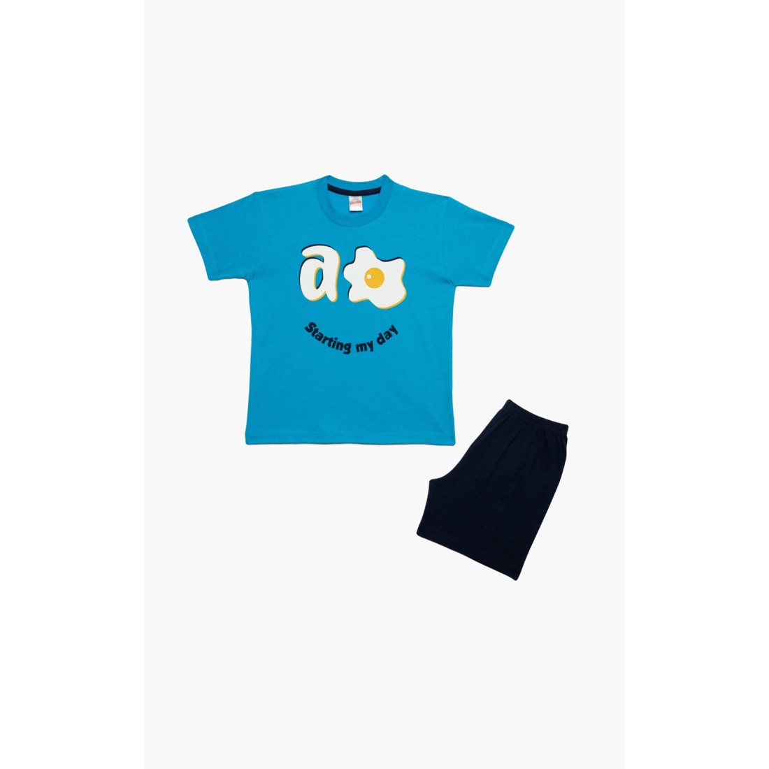 Παιδική θερινή πιτζάμα για αγόρι από 100% απαλό βαμβακερό ύφασμα υψηλής ποιότητας. Το σετ περιλαμβάνει κοντομάνικη μονόχρωμη μπλούζα με στρογγυλή λαιμόκοψη, χιουμοριστικό τύπωμα και μονόχρωμο σορτς με ελαστική μέση. Συνδυάστε με τις αντίστοιχες ανδρικές πιτζάμες και δημιουργήστε το απόλυτο father & son look.