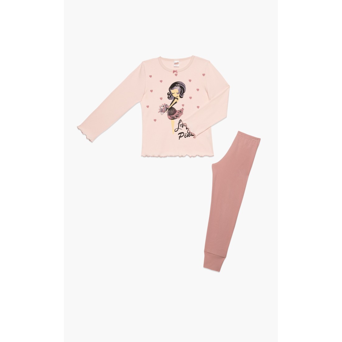 Παιδική χειμερινή πιτζάμα με καρδιές για κορίτσια από 100% βαμβακερό ύφασμα υψηλής ποιότητας. Το σετ περιλαμβάνει μονόχρωμη μπλούζα με στρογγυλή λαιμόκοψη, τύπωμα στο κέντρο και διακοσμητικό φιογκάκι. Συνδυάζεται με μακρύ μονόχρωμο παντελόνι με μπάσκες στο τελείωμα.