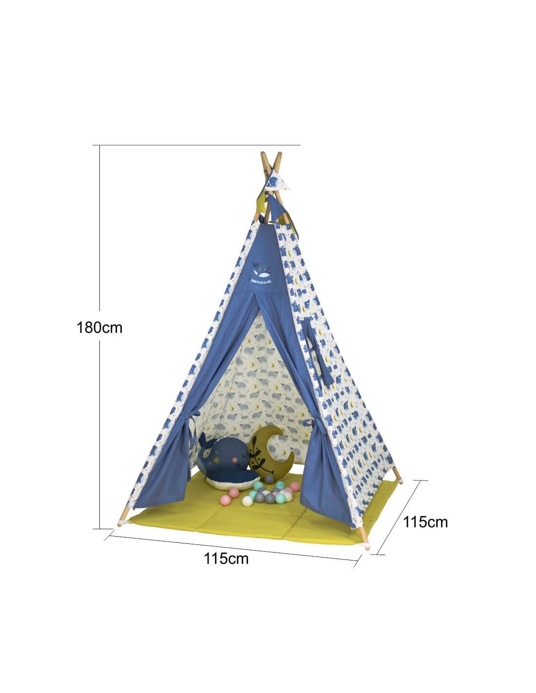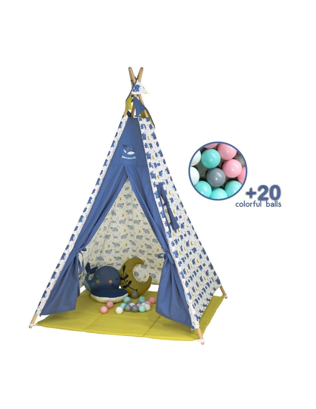 Η παιδική σκηνή περιλαμβάνει το στρωματάκι – χαλάκι για να παίζει άνετα το παιδί σας όταν κάθεται στη σκηνή του, 20 μπάλες σε απαλές αποχρώσεις καθώς και διακοσμητικές σημαίες.