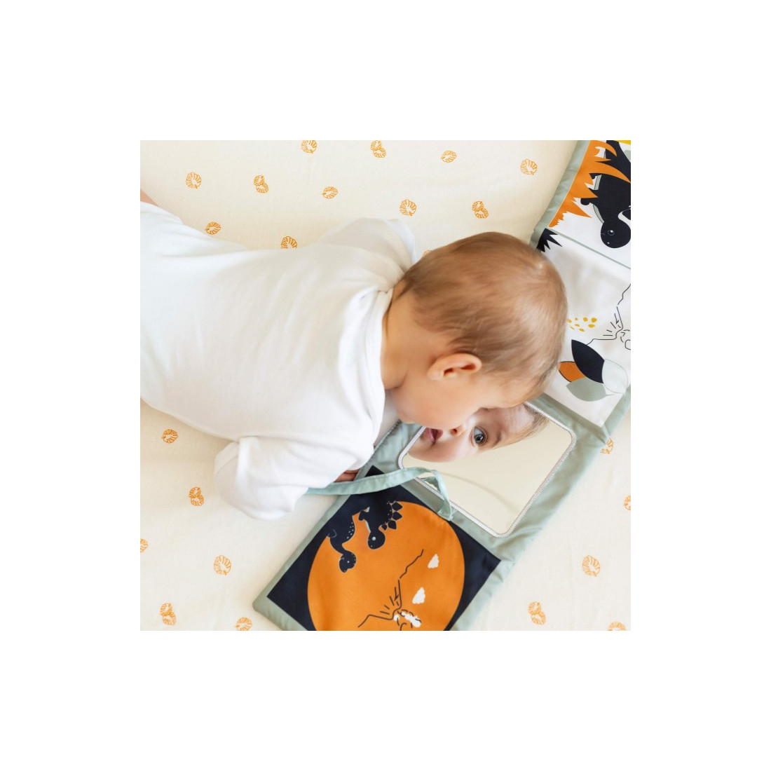 Ανακαλύψτε έναν μαγεμένο κόσμο με το βιβλίο αφύπνισης του μωρού μας! Αυτό το συναρπαστικό βιβλίο βοηθά το μωρό σας να συναντήσει τους αγαπημένους του φίλους: τον ελέφαντα, τον στεγόσαυρο και τον δεινόσαυρο. Διαθέτοντας μαγικές εικονογραφήσεις, είναι βέβαιο ότι θα ενεργοποιήσει τη φαντασία του μικρού σας εξερευνητή. Κατασκευασμένο με φροντίδα από απαλό βαμβάκι, αυτό το μικρό βιβλίο διαθέτει μοντέρνα χρώματα όπως η τερακότα, το πράσινο του νερού, το μουσταρδί και το πορτοκαλί. Αλλά δεν είναι μόνο αυτό! Το βιβλίο μας για πρώιμη μάθηση είναι γεμάτο εκπλήξεις. Διαθέτει έναν μικρό τετράγωνο καθρέφτη, δίνοντας στο μωρό την ευκαιρία να θαυμάσει και να ανακαλύψει τον εαυτό του. Επιπλέον, διπλώνει και ξεδιπλώνεται εύκολα σαν ακορντεόν, επιτρέποντας στο μικρό σας να συλλογιστεί όλες τις εικονογραφήσεις ταυτόχρονα, διεγείροντας την περιέργειά του. Κλείνει εύκολα με 2 μικρές κορδέλες.
