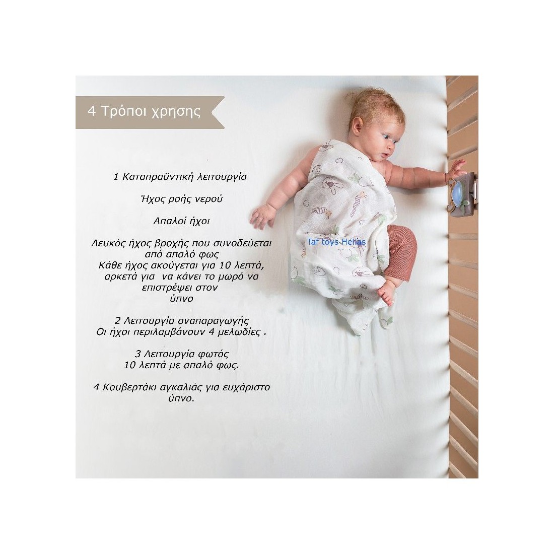 To Bunny blankie της Τaf Toys είναι το πρώτο παιχνίδι προσκόλλησης του μωρού σας. Είναι κατασκευασμένο από 100% απαλό και μαλακό βαμβάκι, σχεδιασμένο να παρέχει άνεση και ασφάλεια σε μωρά και μικρά παιδιά. Το Bunny Blankie είναι ένα εξαιρετικό εργαλείο για να καταπραΰνει και να ανακουφίζει το μωρό κατά τη διάρκεια του ύπνου ,ή στην βόλτα του. Το λούτρινο λαγουδάκι θα γίνει ο αχώριστος φίλος που θα το συντροφεύει παντού και θα του προσφέρει την αίσθηση της ασφάλειας και της θαλπωρής που όλα τα μωρά χρειάζονται. Πλένεται στο πλυντήριο. Μέγεθος: 36X20 cm Στην Taf Toys καταλαβαίνουμε ότι η επιλογή του κατάλληλου αναπτυξιακού παιχAνιδιού για το παιδί σας είναι μια σοβαρή απόφαση. Η μεγάλη γκάμα προϊόντων της Taf Toys σας παρέχει αναπτυξιακά παιχνίδια που αντιστοιχούν στην ηλικία του μωρού σας και που είναι προκλητικά, διασκεδαστικά και εμπνέουν τη φαντασία. Όλα τα παιχνίδια μας έχουν δημιουργηθεί με σκοπό να προωθήσουν τη συναισθηματική, γνωστική και σωματική ανάπτυξη του μωρού σας κατά τα δύο πρώτα χρόνια ανάπτυξής του. Στόχος μας είναι να βοηθήσουμε το μωρό σας να δημιουργήσει τα θεμέλια για μια υγιή και ευτυχισμένη αναπτυξιακή πορεία. Κείμενο και φωτογραφίες των προϊόντων δημοσιεύονται μόνο με την γραπτή συγκατάθεση από την Taf Toys Hellas όπου και αποτελούν πνευματική ιδιοκτησία.