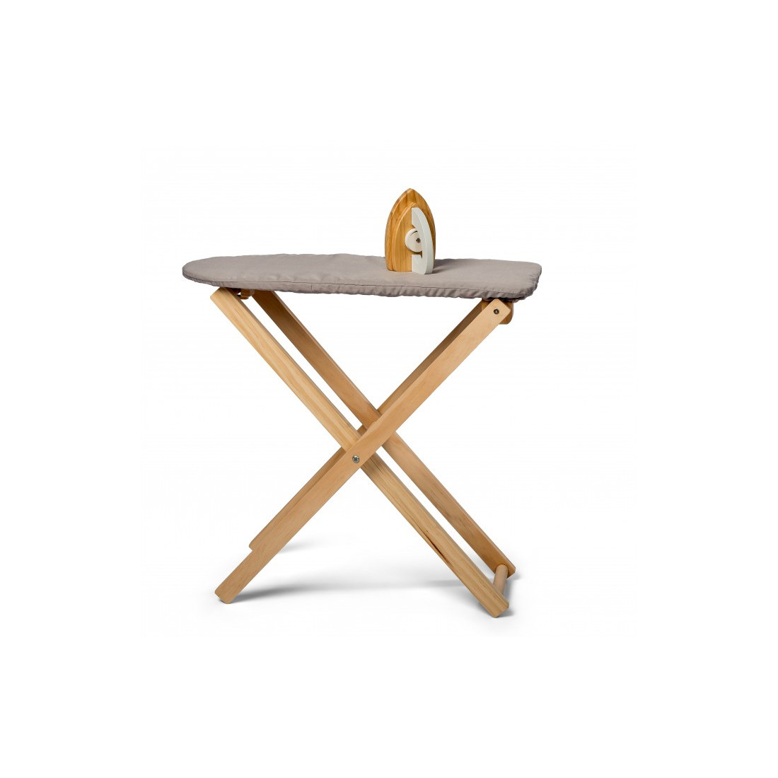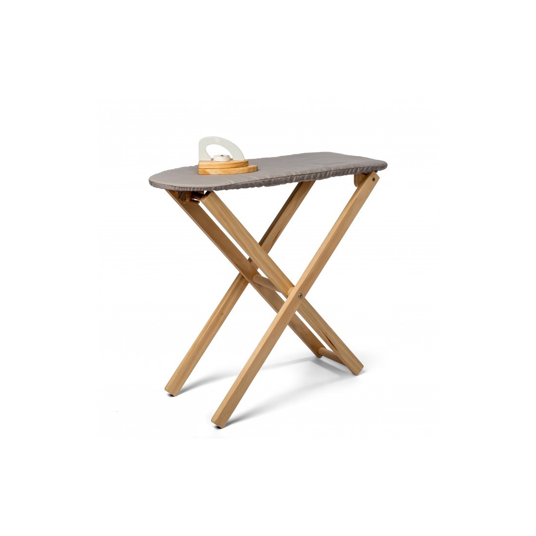 Η επιφάνεια της σιδερώστρας είναι καλυμμένη με γκρι πανί και το σίδερο έχει ένα πόμολο που κάνει έναν ήχο κρότου.