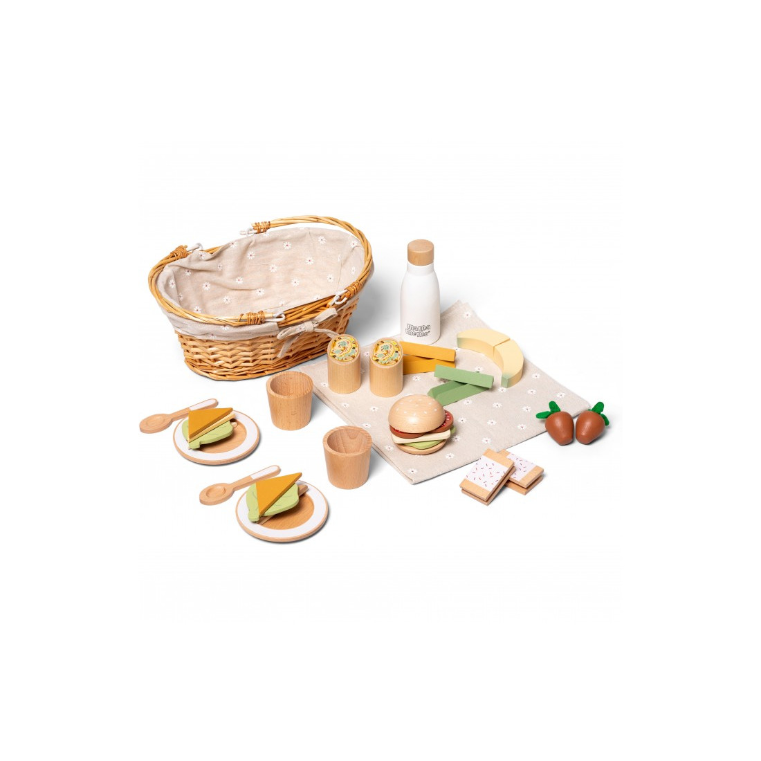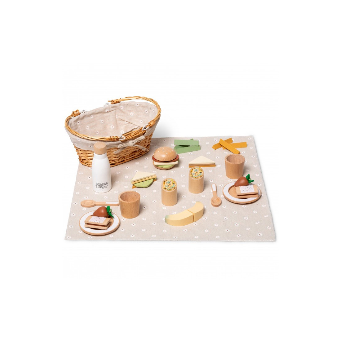 Συνοδεύεται από ένα χαλί για πικνίκ που ταιριάζει με το καλάθι του πικνίκ και τα όμορφα ξύλινα σερβίτσια. Τα φαγητά του καλαθιού είναι διασπώμενα και τα μέρη τους ενώνονται με αυτοκόλλητο Velcro.