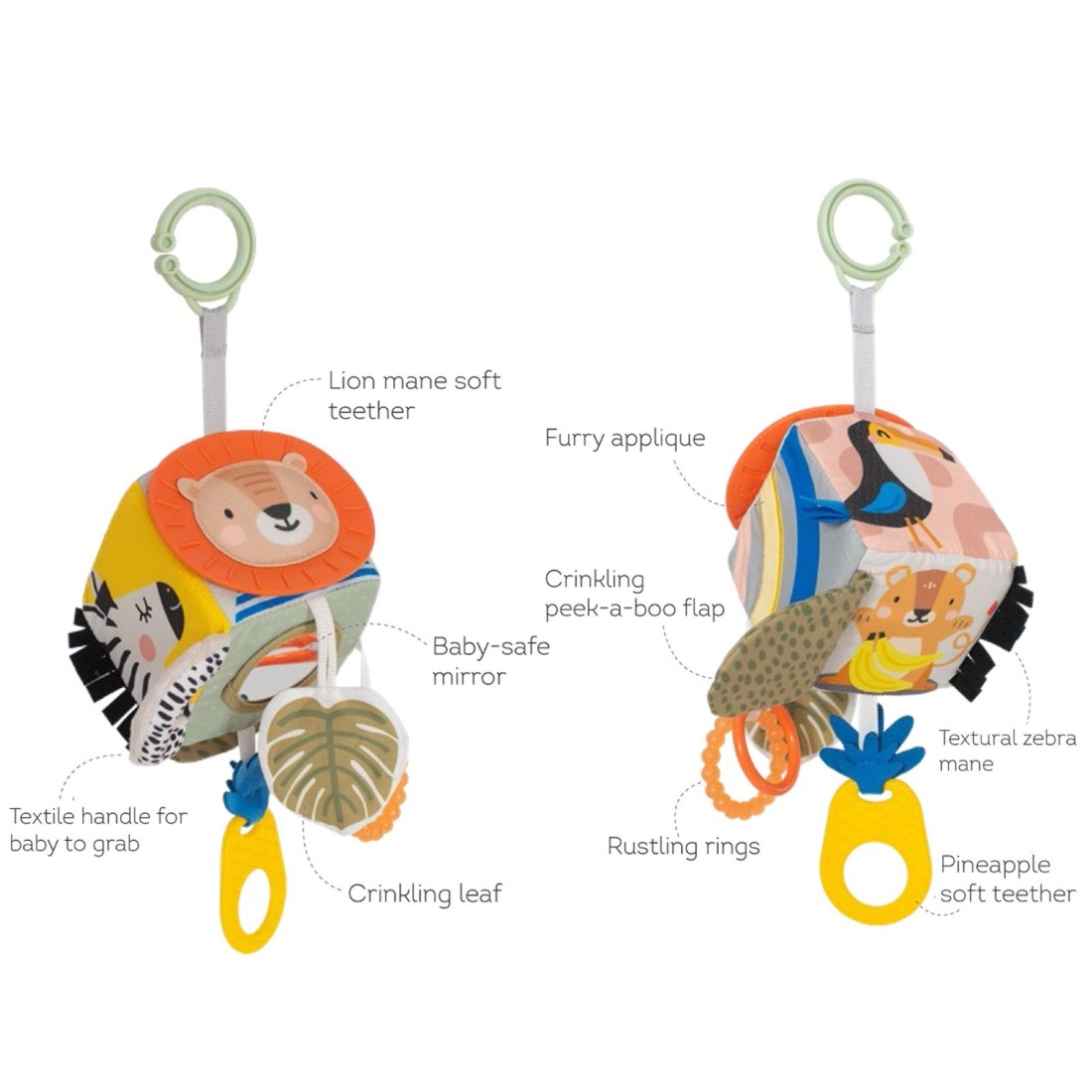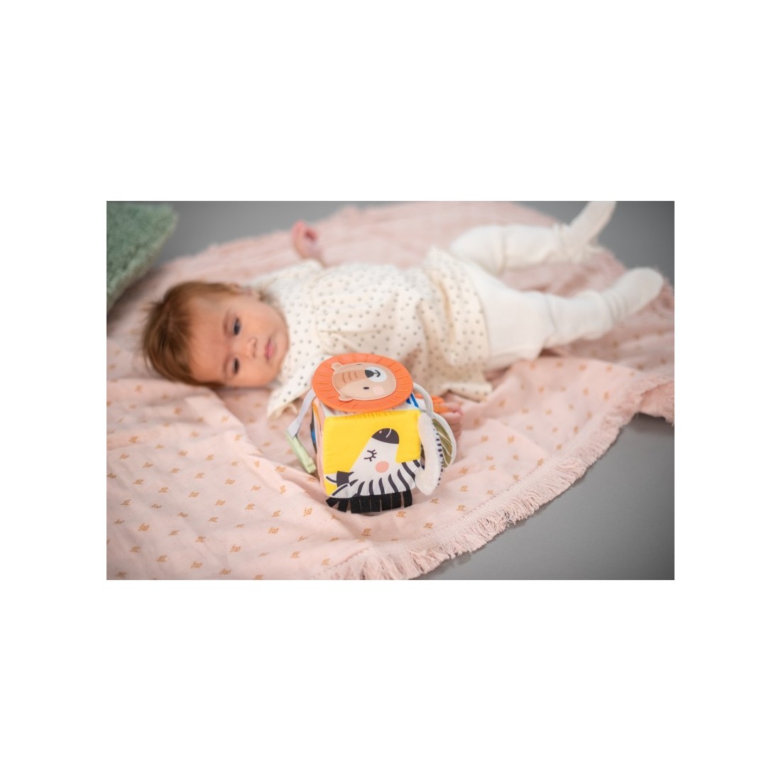 Το μαλακό παιχνίδι κύβος περιλαμβάνει, μασητικό οδοντοφυΐας, βρεφικό καθρέφτη ασφαλείας, κορδέλες, κρίκους , υφάσματα με ήχο θροΐσματος και τμήματα υφασμάτων με πτυχώσεις και  εικόνες που προωθούν την έννοια της απόκρυψης-εμφάνισης.