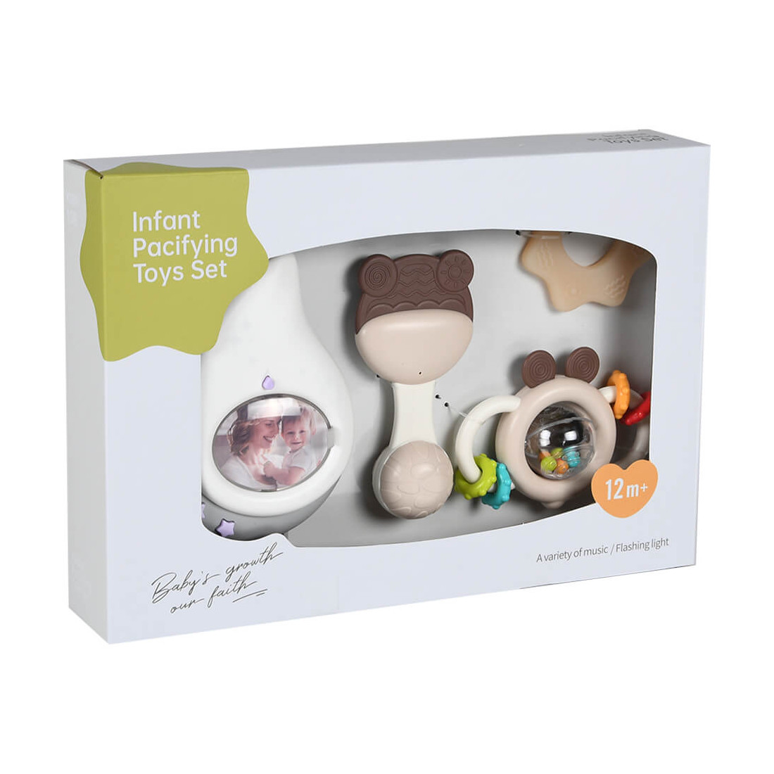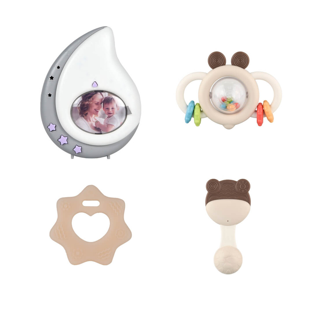 Το σετ διαθέτει λάμπα νυκτός, μασητικά και κουδουνίστρες. Όλα είναι κατασκευασμένα από υψηλής ποιότητας υλικά, μη τοξικά.
