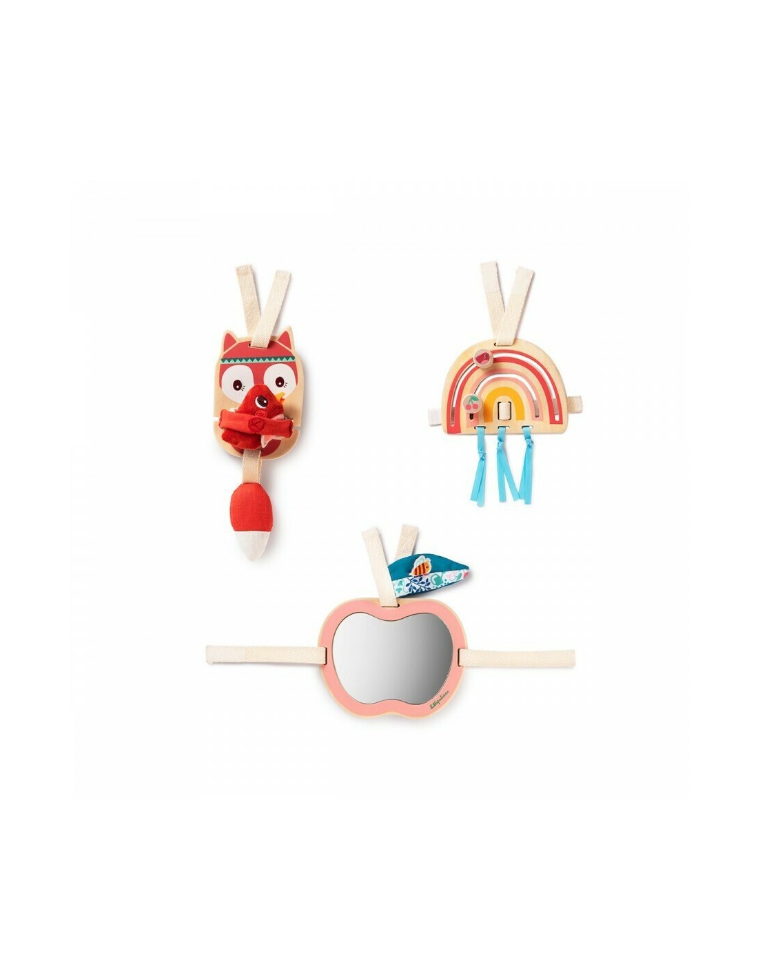 Αυτό το σετ, που αποτελείται από 3 ξεχωριστά κρεμαστά παιχνίδια, προσαρμόζεται εύκολα στο παρκοκρέβατο. Κάθε παιχνίδι διαθέτει ένα ευρύ φάσμα διαφορετικών υλικών και δραστηριοτήτων. Προστάτευσε το πουλάκι στην αγκαλιά της Άλις! Μετακίνησε τα κεράσια και το πουλάκι πάνω στο ουράνιο τόξο και χρησιμοποίησε το μήλο για να τα ανακαλύψεις όλα!