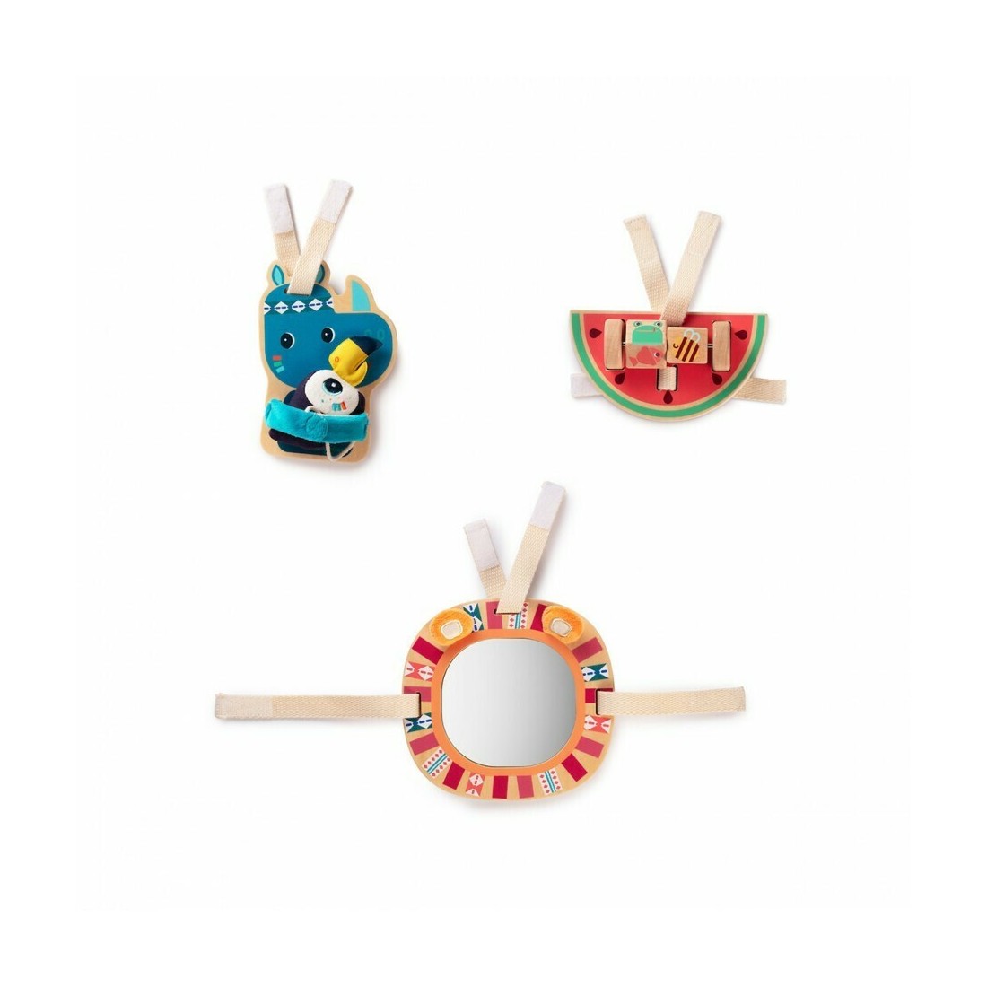 Αυτό το σετ, που αποτελείται από 3 ξεχωριστά κρεμαστά παιχνίδια, προσαρμόζεται εύκολα στο παρκοκρέβατο. Κάθε παιχνίδι διαθέτει ένα ευρύ φάσμα διαφορετικών υλικών και δραστηριοτήτων. Προστάτευσε το πουλάκι στην αγκαλιά του Μάριους! Ταίριαξε τα σχήματα στο καρπούζι και χρησιμοποίησε τον βασιλιά των ζώων για να τα ανακαλύψεις όλα!
