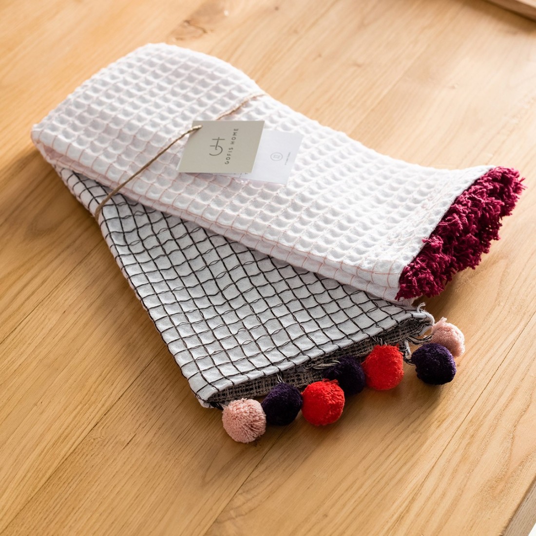 Σετ από δύο αφράτες πετσέτες με γκοφρέ ύφανση και ειδική επεξεργασία SANFORIZED που διατηρεί το μέγεθος ίδιο μετά το πλύσιμο. Διακοσμημένες με κομποζέ χρωματιστό κροσάκι και βαμβακερά pom pom.