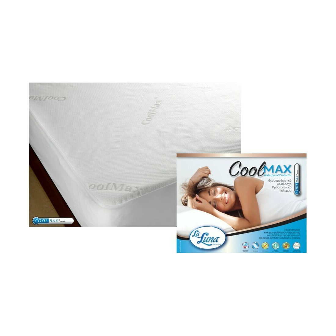 Αδιάβροχο προστατευτικό κάλυμμα στρώματος με εξαιρετική απορροφητικότητα. Χάρη στην ιδιαίτερη δομή των ινών του. απορροφά την υγρασία από το σώμα και ακολούθως την απομακρύνει από το στρώμα. συμβάλλοντας στη διατήρηση μιας σταθερής θερμοκρασίας κατά τη διάρκεια του ύπνου. Είναι εξαιρετικά μαλακό και διαπνέον ύφασμα·δεν τσαλακώνεται και στεγνώνει πολύ εύκολα και γρήγορα. Η ιδιαιτερότητα του υδροφοβικού του υφάσματος. το καθιστά ιδανικό για άτομα με έντονη εφίδρωση. Ύφασμα: Coolmax (40% Coolmax - 60% Polyester). Η περιμέτρικη φούστα 35cm είναι Jersey ελαστική και καλύπτει στρώμα έως 40cm πάχος. Διαθέτουν περιμετρικό λάστιχο για εύκολη εφαρμογή.