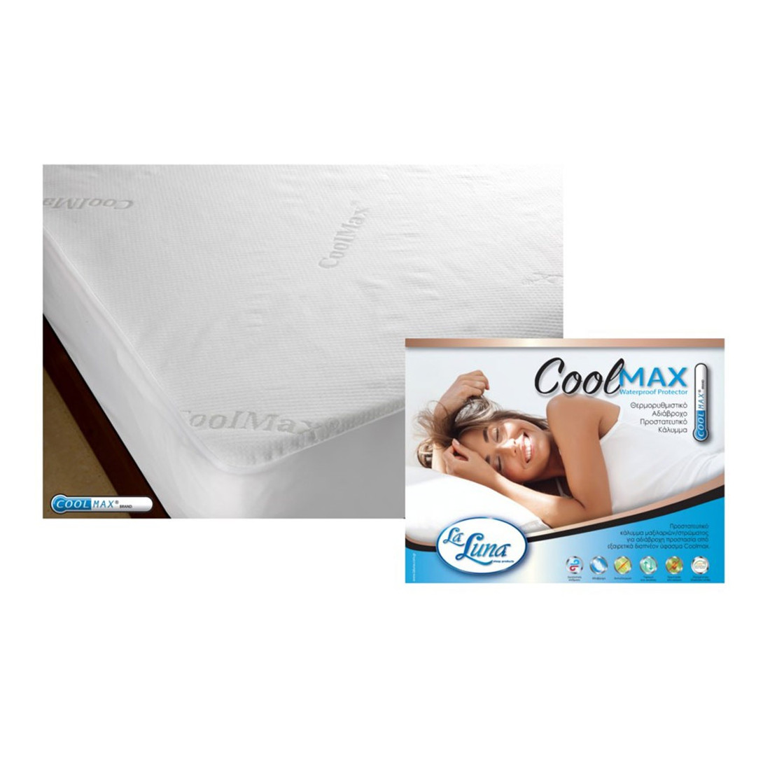 Προστατευτικό αδιάβροχο επίστρωμα της εταιρείας La Luna. Είναι κατασκευασμένο από ύφασμα coolmax, 100% polyester που απορροφά την υγρασία από το σώμα και στην συνέχεια την απομακρύνει από το στρώμα, συμβάλλοντας στην διατήρηση μιας σταθερής θερμοκρασίας κατά την διάρκεια του ύπνου. Είναι πολύ μαλακό, δεν εμποδίζει την ροή του αέρα, δεν τσαλακώνεται και στεγνώνει εύκολα. Ιδανικό για άτομα με έντονη εφίδρωση.