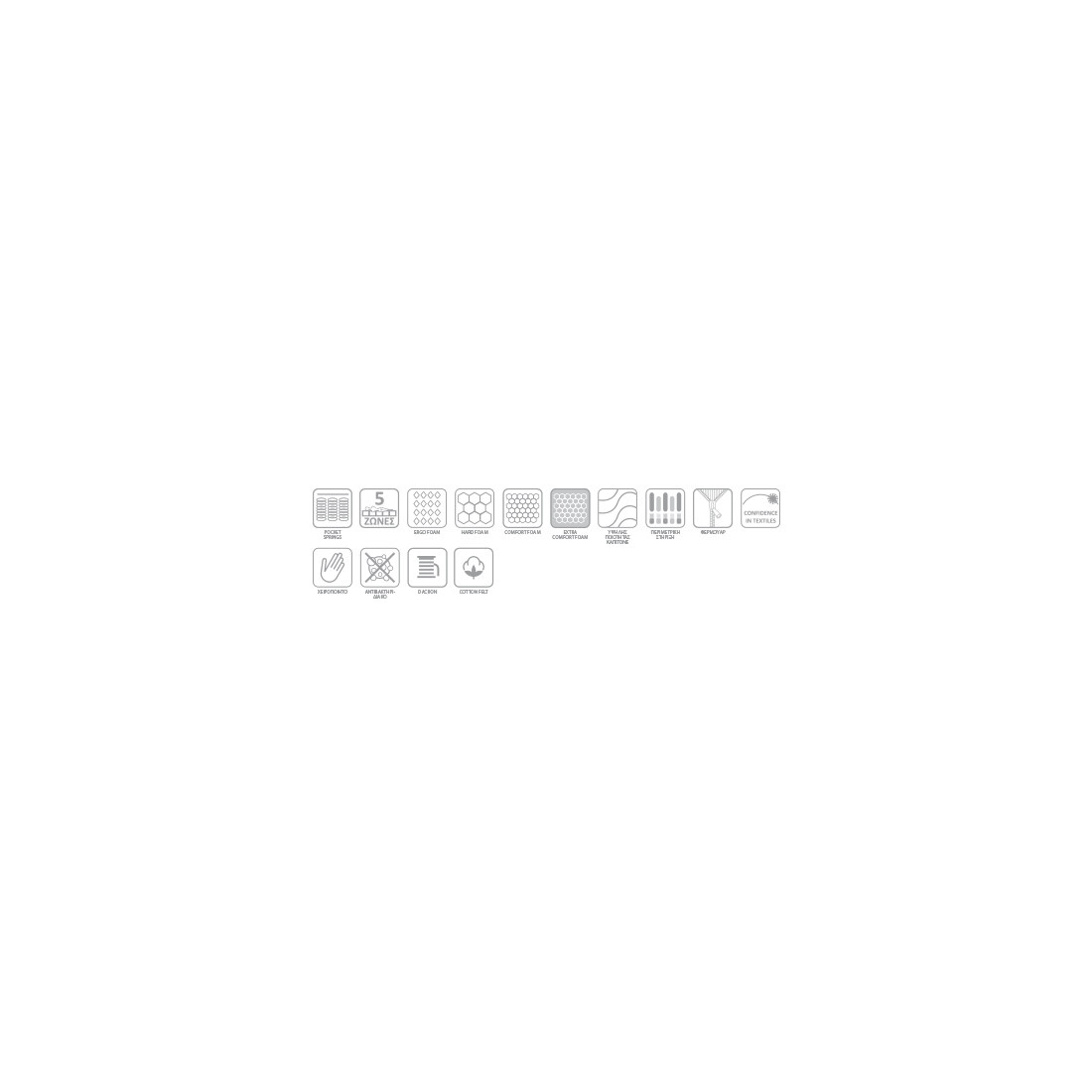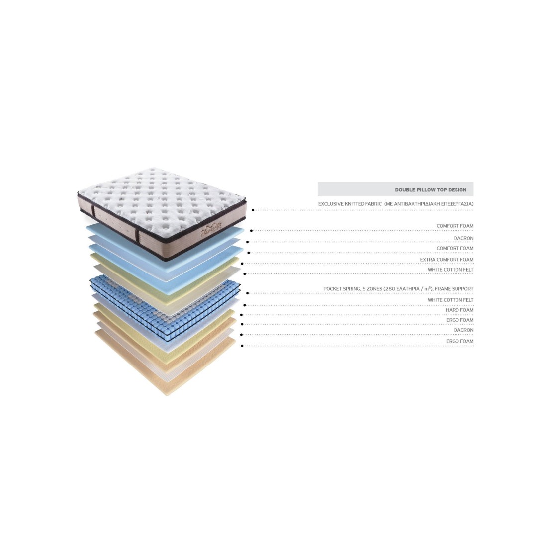 Ένα μοναδικό στρώμα με pocket spring 5 ζωνών 280 τεμ/m2 για σωστή στήριξη της σπονδυλικής στήλης και διπλό pillow top για διαφορετική αίσθηση από κάθε πλευρά. Μαλακό αγκάλιασμα από την μία πλευρά και σταθερή αίσθηση από την άλλη.