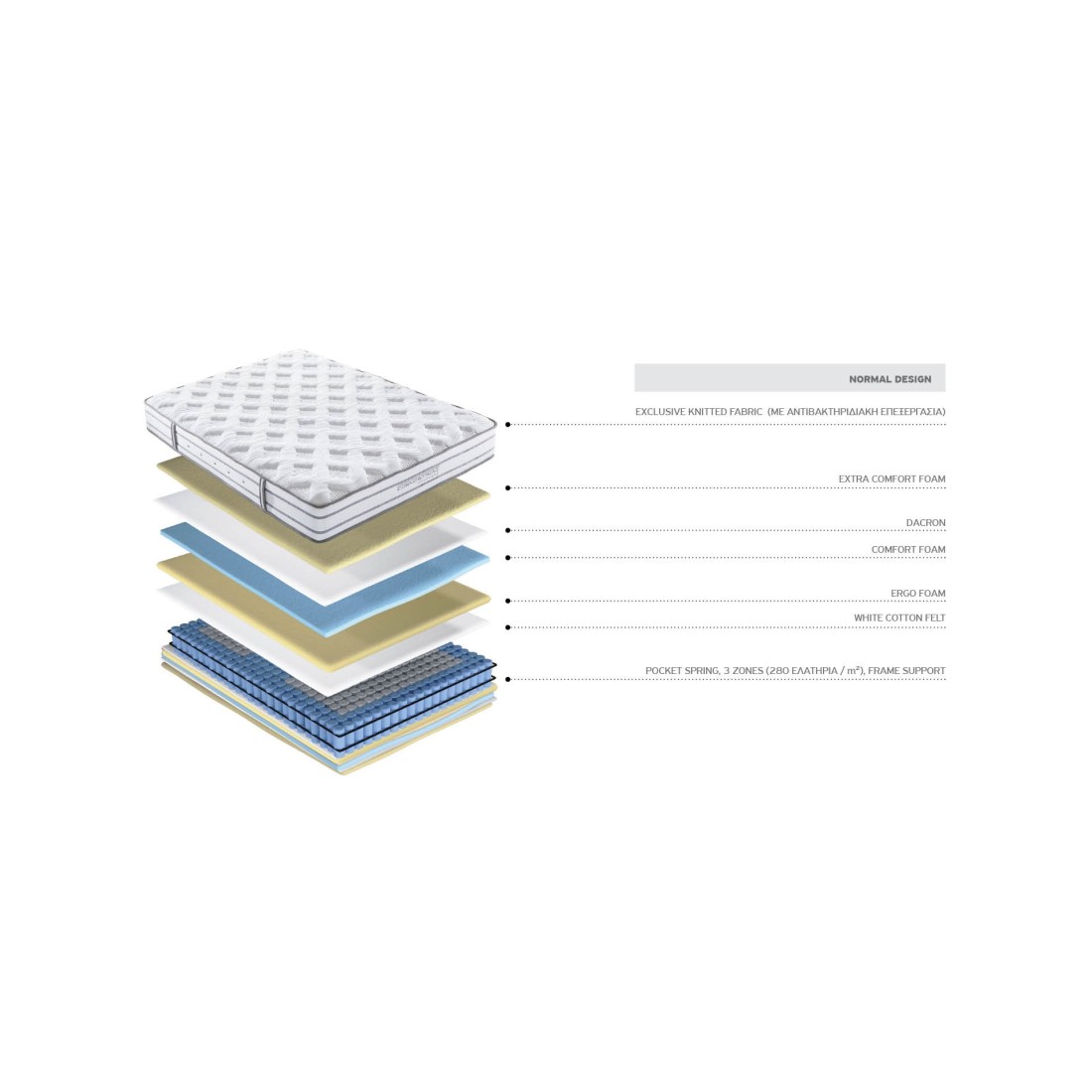 Το στρώμα Power είναι ένα στρώμα κατασκευασμένο με ελατήρια pocket spring 3 ζωνών 280 τεμ / m2 που αγκαλιάζει τις καμπύλες του σώματος. Με τις τρείς ζώνες του στηρίζει καλύτερα τη μέση και τους γοφούς. Για ένα ξεκούραστο και αναπαυτικό ύπνο κάθε βράδυ.