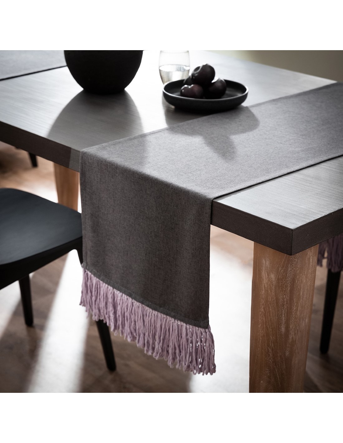 Από ανθεκτικό μονόχρωμο ύφασμα με χνούδι στην επιφάνεια και λιλά μακρύ κρόσσι στο τελείωμα.