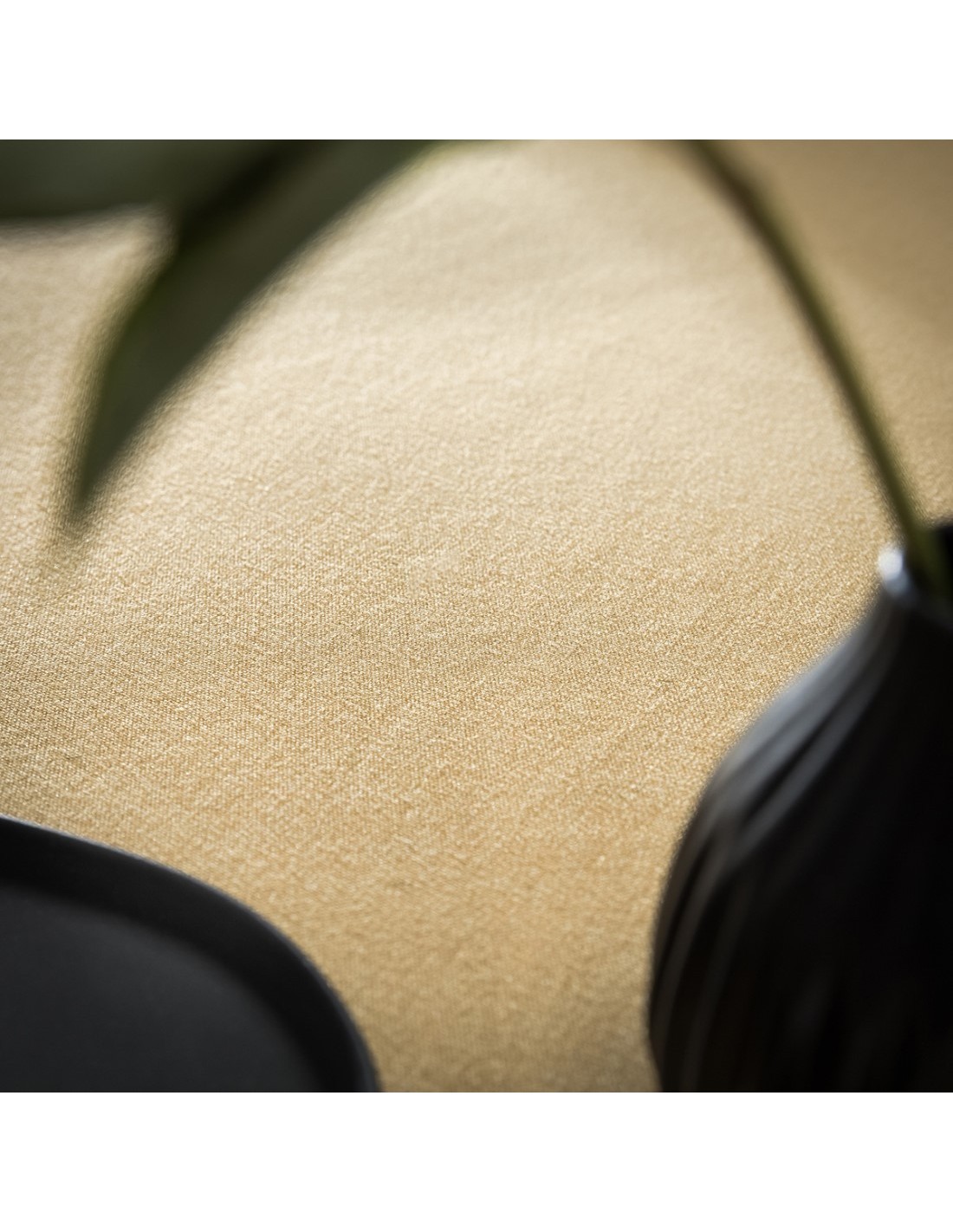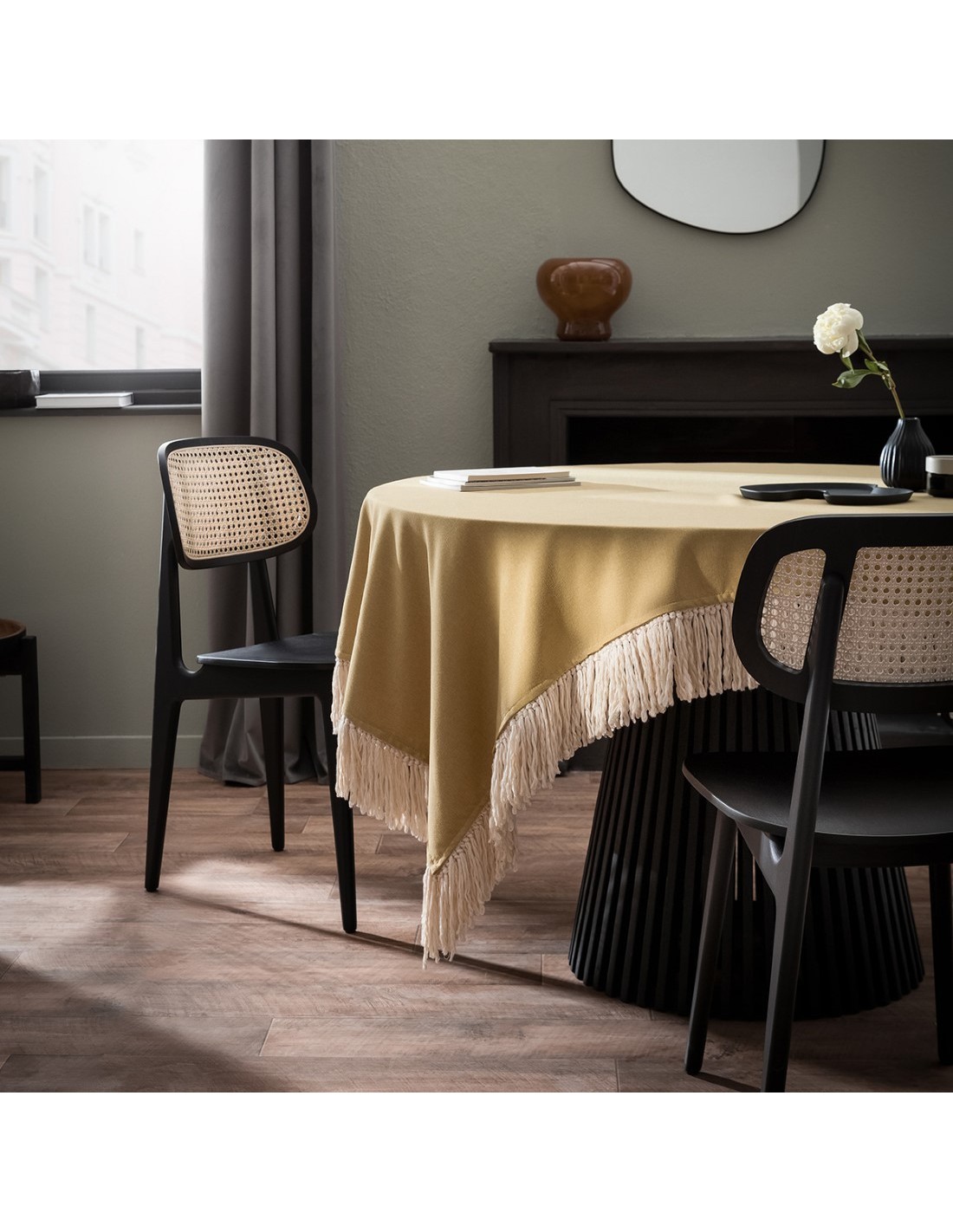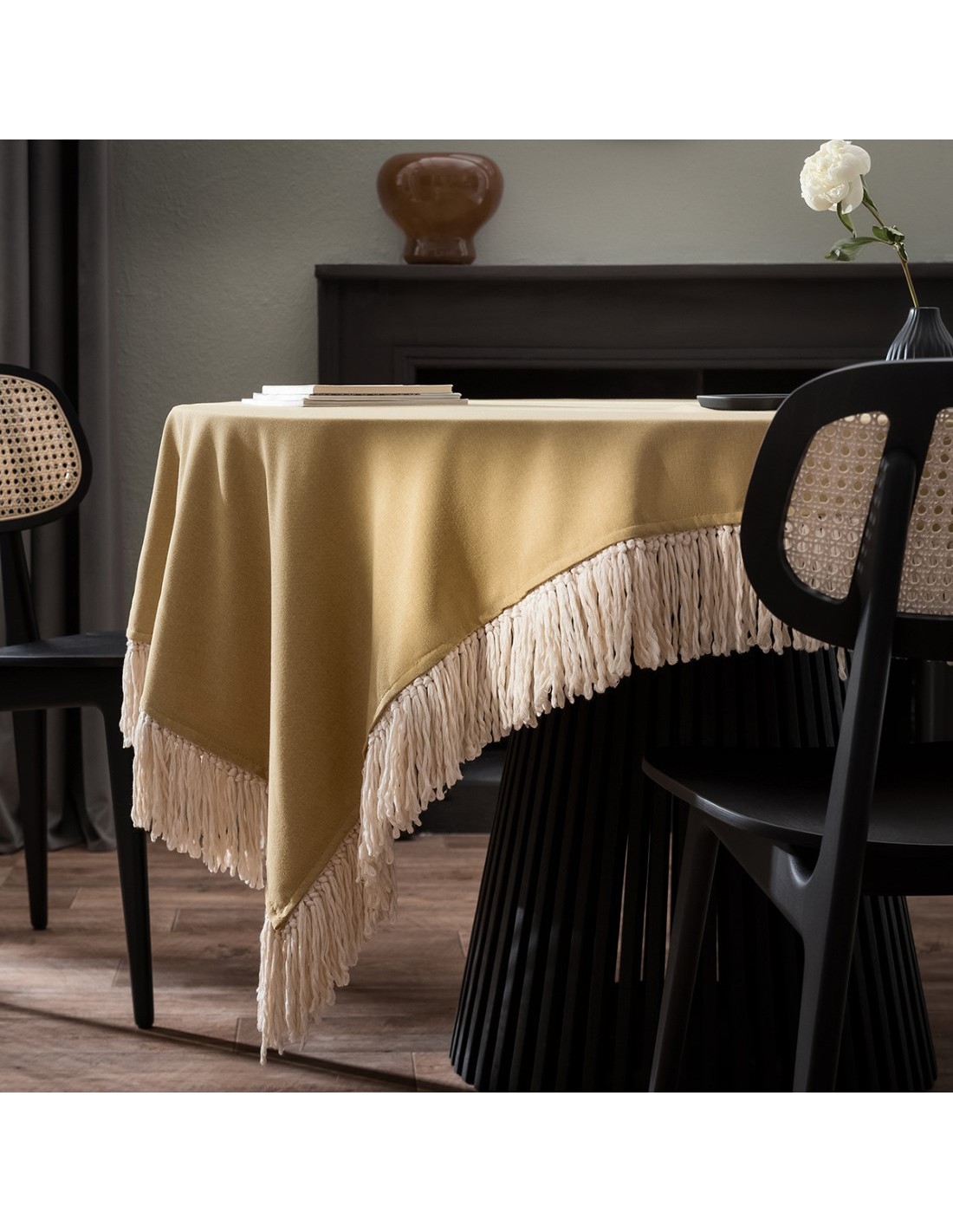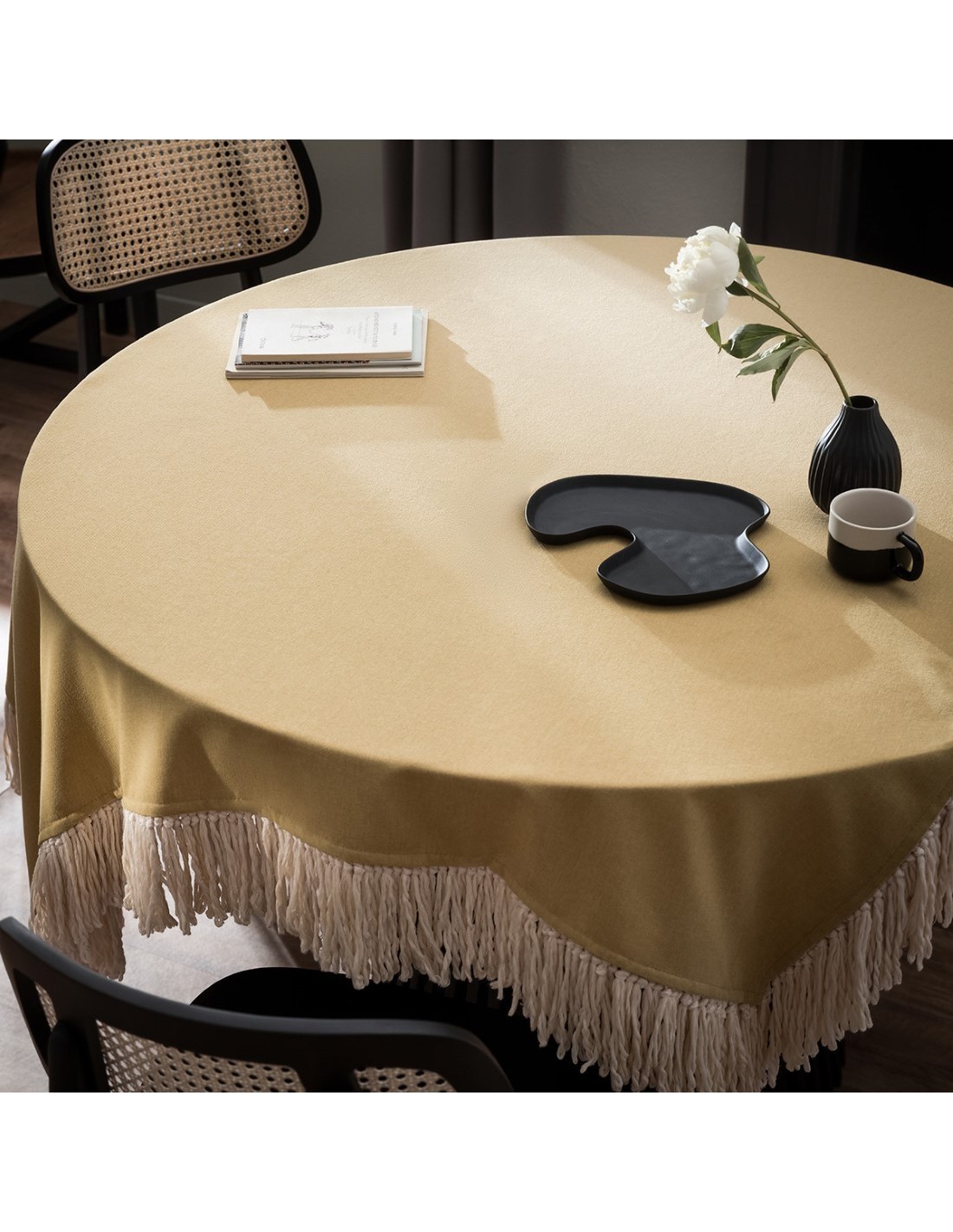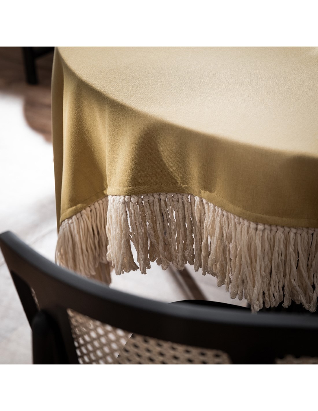 Από ανθεκτικό μονόχρωμο ύφασμα με χνούδι στην επιφάνεια και εκρού μακρύ κρόσσι περιμετρικά.
