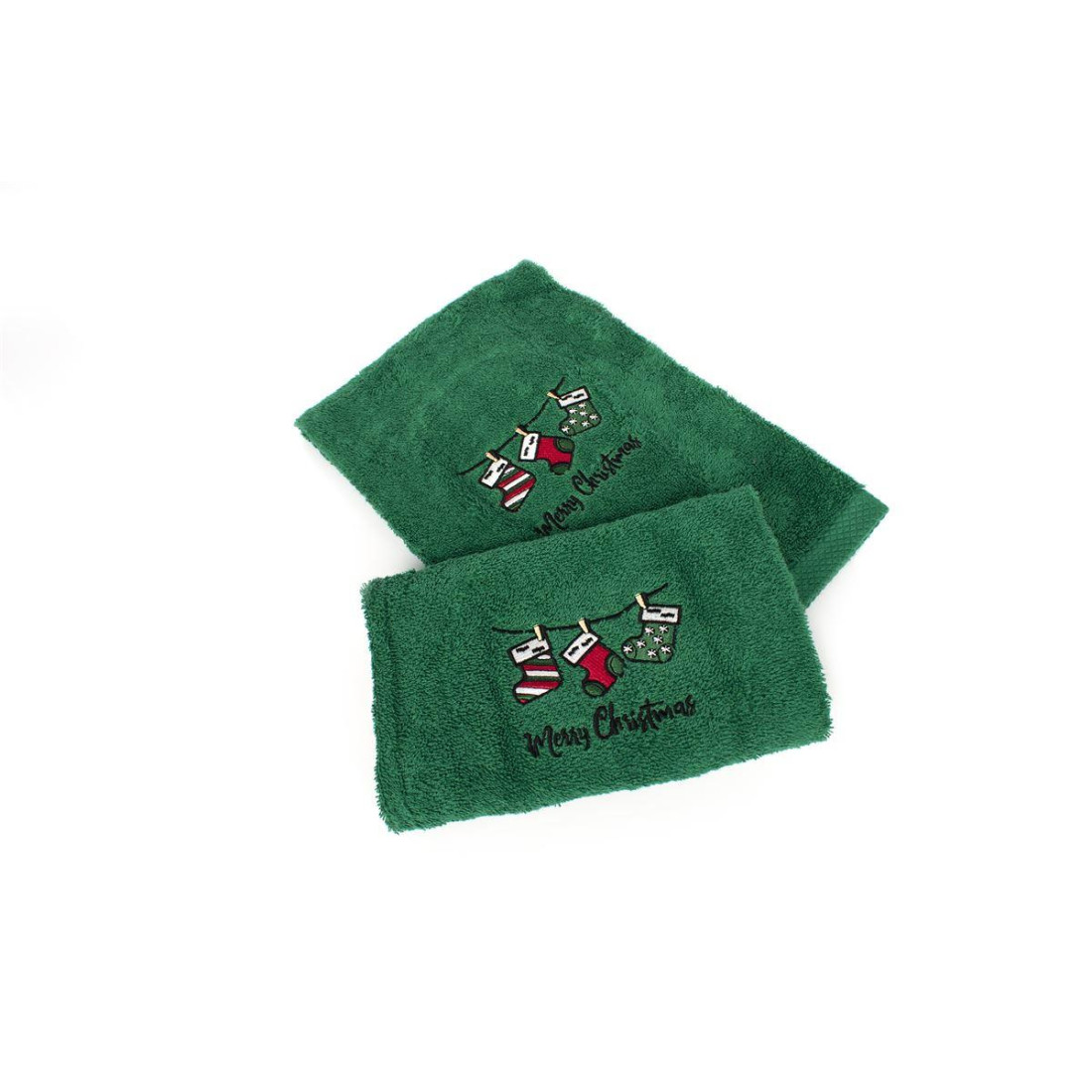 Σετ πετσέτες Χριστουγεννιάτικες 2 τεμ. σε χρώμα πράσινο. με ανεξίτηλα χρώματα και κεντημένο σχέδιο που απεικονίζει γιορτινές κάλτσες. ιδανικό για δώρο που περιέχει: 1 τεμ. πετσέτα χειρός. διαστάσεων 30X50 και 1 τεμ. πετσέτα προσώπου. διαστάσεων 50X90. Οι πετσέτες είναι κατασκευασμένες από 100% βαμβάκι έξτρα απαλό και απορροφητικό και είναι ελεγμένες για επιβλαβείς ουσίες με το αναγνωρισμένο παγκοσμίως πιστοποιητικό. OEKO TEX® Standard 100. Συσκευασία δώρου με γιορτινή κορδέλα.