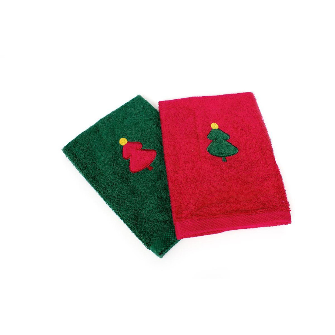 Σετ πετσέτες Χριστουγεννιάτικες 2 τεμ. με ανεξίτηλα χρώματα και κεντημένο σχέδιο που απεικονίζει γιορτινό Χριστουγεννιάτικο δέντρο. ιδανικό για δώρο που περιέχει που περιέχει: 2 πετσέτες χειρός. διαστάσεων 40X60. μία σε κόκκινο και μία σε πράσινο χρώμα. Οι πετσέτες είναι κατασκευασμένες από 100% βαμβάκι έξτρα απαλό και απορροφητικό και είναι ελεγμένες για επιβλαβείς ουσίες με το αναγνωρισμένο παγκοσμίως πιστοποιητικό. OEKO TEX® Standard 100. Συσκευασία δώρου με γιορτινή κορδέλα.