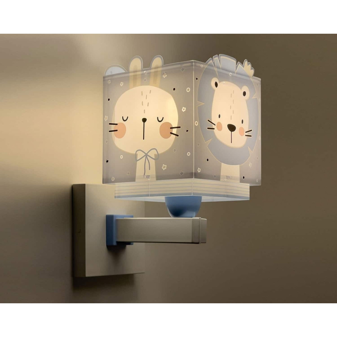 Φωτιστικό απλίκα της εταιρείας Ango σε γαλάζιο χρώμα με σχέδιο ζωάκια. Κατασκευασμένη από πολυπροπυλένιο, λευκά και διάφανα πλαστικά μέρη στήριξης. Πλαίσιο στήριξης με έτοιμες υποδοχές για μόνιμη τοποθέτηση στον τοίχο. Οι βίδες και βύσματα στήριξης για τον τοίχο συμπεριλαμβάνονται. Ελαφρά συναρμολόγηση των τοιχωμάτων στη βάση απαιτείται κατά την τοποθέτηση. Μεγάλο σε μέγεθος φωτιστικό, ιδανικό για γενικό ή συμπληρωματικό φωτισμό. Δυνατότητα τοποθέτησης είτε με σύνδεση σε έτοιμη αναμονή παροχής ρεύματος στον τοίχο είτε σε πρίζα με καλώδιο και διακόπτη, που συμπεριλαμβάνεται στη συσκευασία. Διπλού τοιχώματος με ανεξίτηλη εκτύπωση στο διάφανο εξωτερικό του και μέρη που φωσφορίζουν στο σκοτάδι. **Απαιτείται μόνιμη τοποθέτηση από πιστοποιημένο ηλεκτρολόγο.** Τύπος ντουί: 1 Χ E27 με θέση για έναν λαμπτήρα οικονομίας ισχύος έως 23W ή Led(δεν συμπεριλαμβάνεται). Τροφοδοσία ρεύματος 220V–240V. Κατασκευασμένο εξ ολοκλήρου στην Ευρώπη. Ασφάλεια με πιστοποιήσεις στους κανόνες ασφαλείας της ΕΕ. Ενεργειακής κλάσης Α++. Το Baby Jungle Blue φωτιστικό απλίκα συμπληρώνει τα υπόλοιπα παιδικά φωτιστικά της συλλογής.