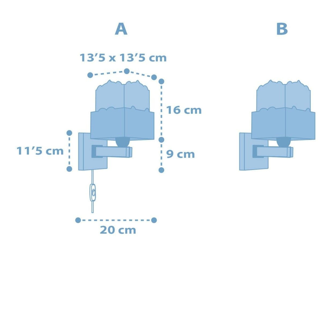 Φωτιστικό απλίκα της εταιρείας Ango σε γαλάζιο χρώμα με σχέδιο πάντα. Κατασκευασμένη από πολυπροπυλένιο, λευκά και διάφανα πλαστικά μέρη στήριξης. Πλαίσιο στήριξης με έτοιμες υποδοχές για μόνιμη τοποθέτηση στον τοίχο. Οι βίδες και βύσματα στήριξης για τον τοίχο συμπεριλαμβάνονται. Ελαφρά συναρμολόγηση των τοιχωμάτων στη βάση απαιτείται κατά την τοποθέτηση. Μεγάλο σε μέγεθος φωτιστικό, ιδανικό για γενικό ή συμπληρωματικό φωτισμό. Δυνατότητα τοποθέτησης είτε με σύνδεση σε έτοιμη αναμονή παροχής ρεύματος στον τοίχο είτε σε πρίζα με καλώδιο και διακόπτη, που συμπεριλαμβάνεται στη συσκευασία. Διπλού τοιχώματος με ανεξίτηλη εκτύπωση στο διάφανο εξωτερικό του και μέρη που φωσφορίζουν στο σκοτάδι. **Απαιτείται μόνιμη τοποθέτηση από πιστοποιημένο ηλεκτρολόγο.** Τύπος ντουί: 1 Χ E27 με θέση για έναν λαμπτήρα οικονομίας ισχύος έως 23W ή Led(δεν συμπεριλαμβάνεται). Τροφοδοσία ρεύματος 220V–240V. Κατασκευασμένο εξ ολοκλήρου στην Ευρώπη. Ασφάλεια με πιστοποιήσεις στους κανόνες ασφαλείας της ΕΕ. Ενεργειακής κλάσης Α++. Το Panda Blue φωτιστικό απλίκα συμπληρώνει τα υπόλοιπα παιδικά φωτιστικά της συλλογής.