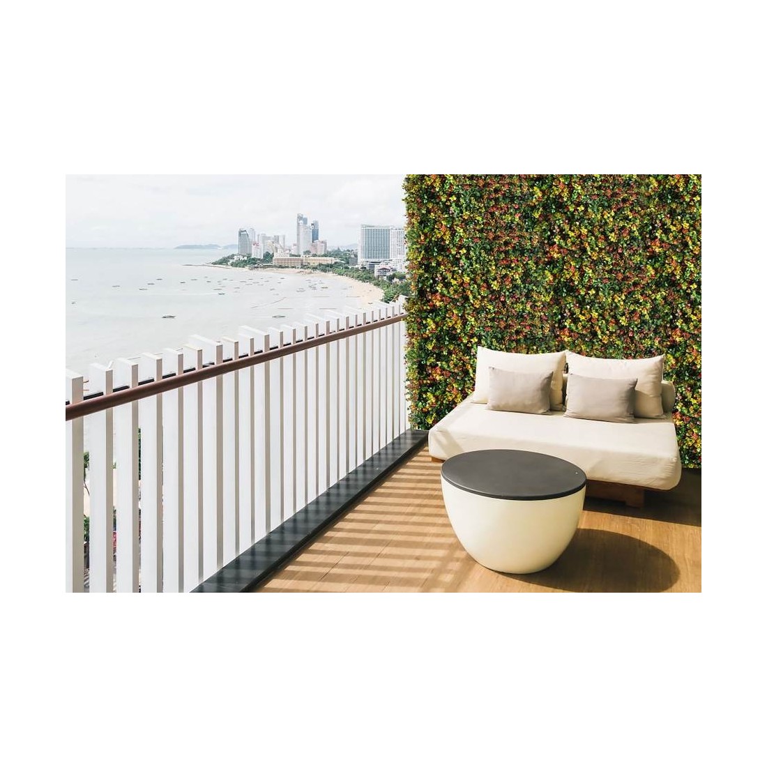 Συνθετικό διακοσμητικό πάνελ με πυκνή φυλλωσιά, σε πλακίδιο 1m x 1m. Έχει τρισδιάστατη όψη και δίνει μια αίσθηση ζωντάνιας και φυσικότητας στον χώρο σας. Διακοσμήστε τον εξωτερικό ή εσωτερικό χώρο σας με τα πάνελ φυλλωσιάς και δημιουργήστε έναν μοναδικό κάθετο κήπο.